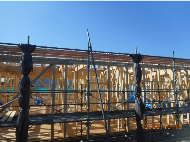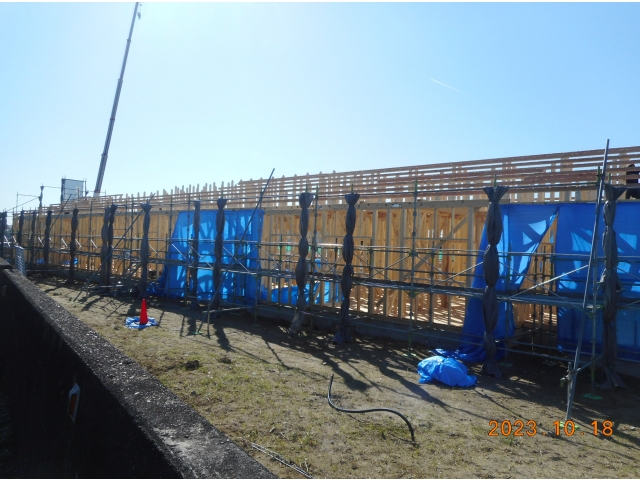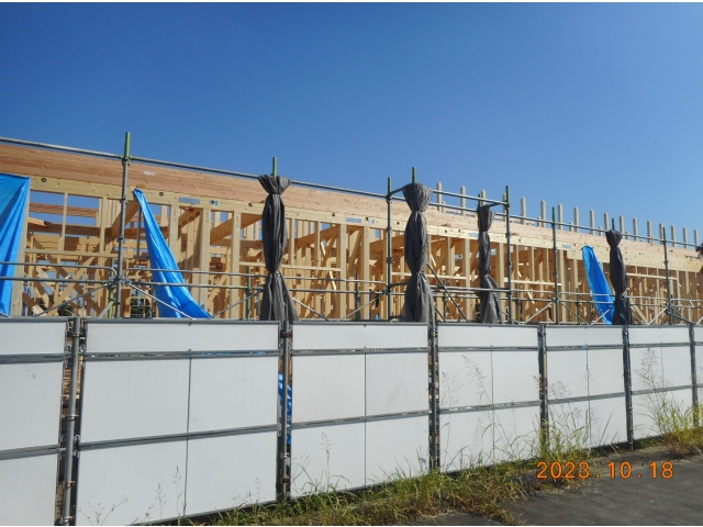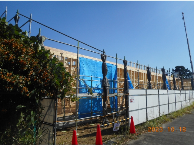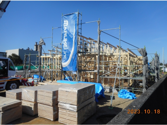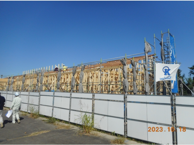 基礎工事が終わり、木材で建物の建設が始まりました。木材は、全て工場で切り出しや加工を終え、現場では、ほぼ組み立てる作業のみとのことです。今週末にも、屋根がコンパネで取り付けられるとのことで、作業の速さに驚いてしまいます。