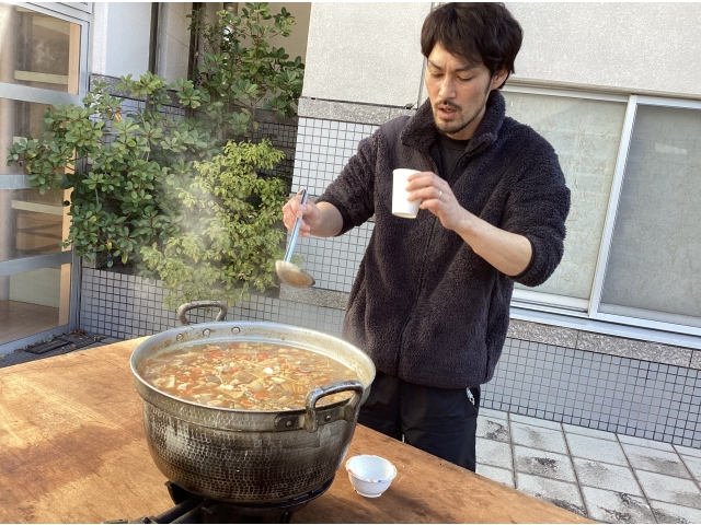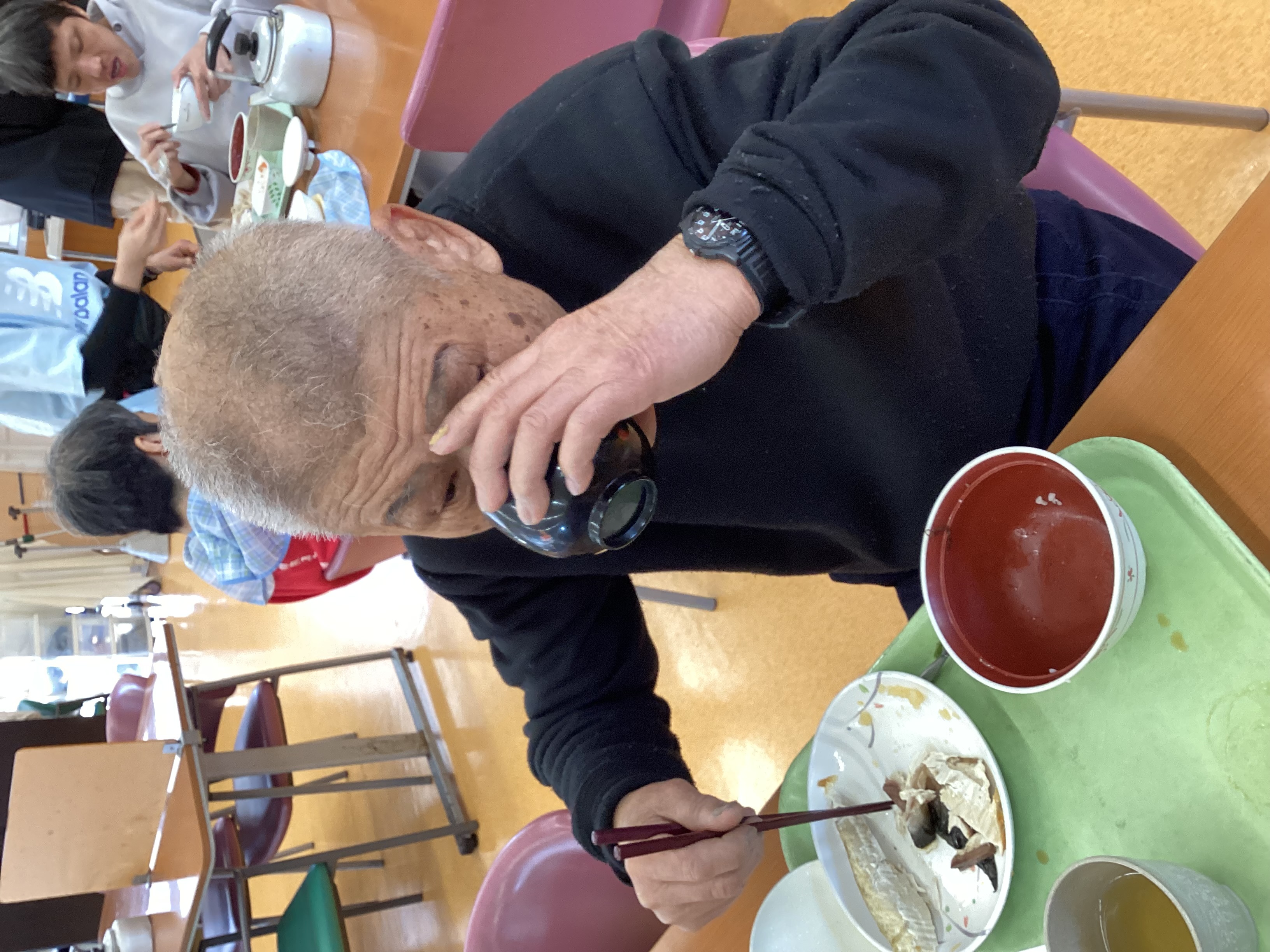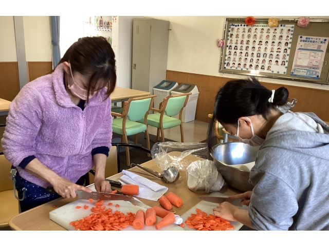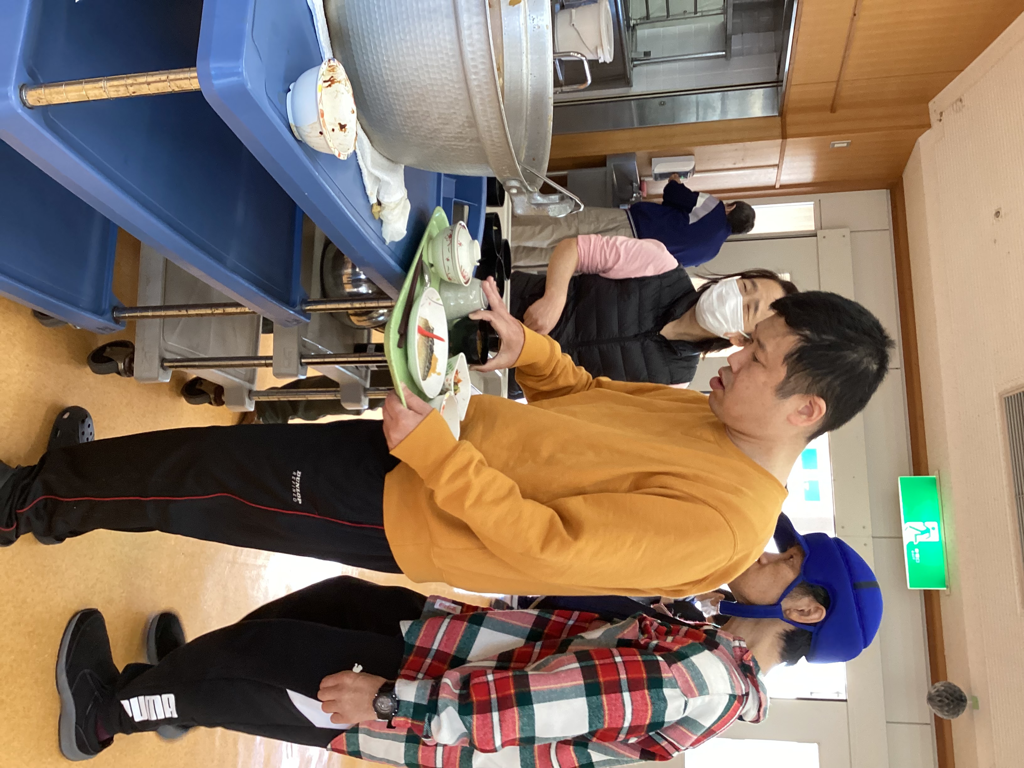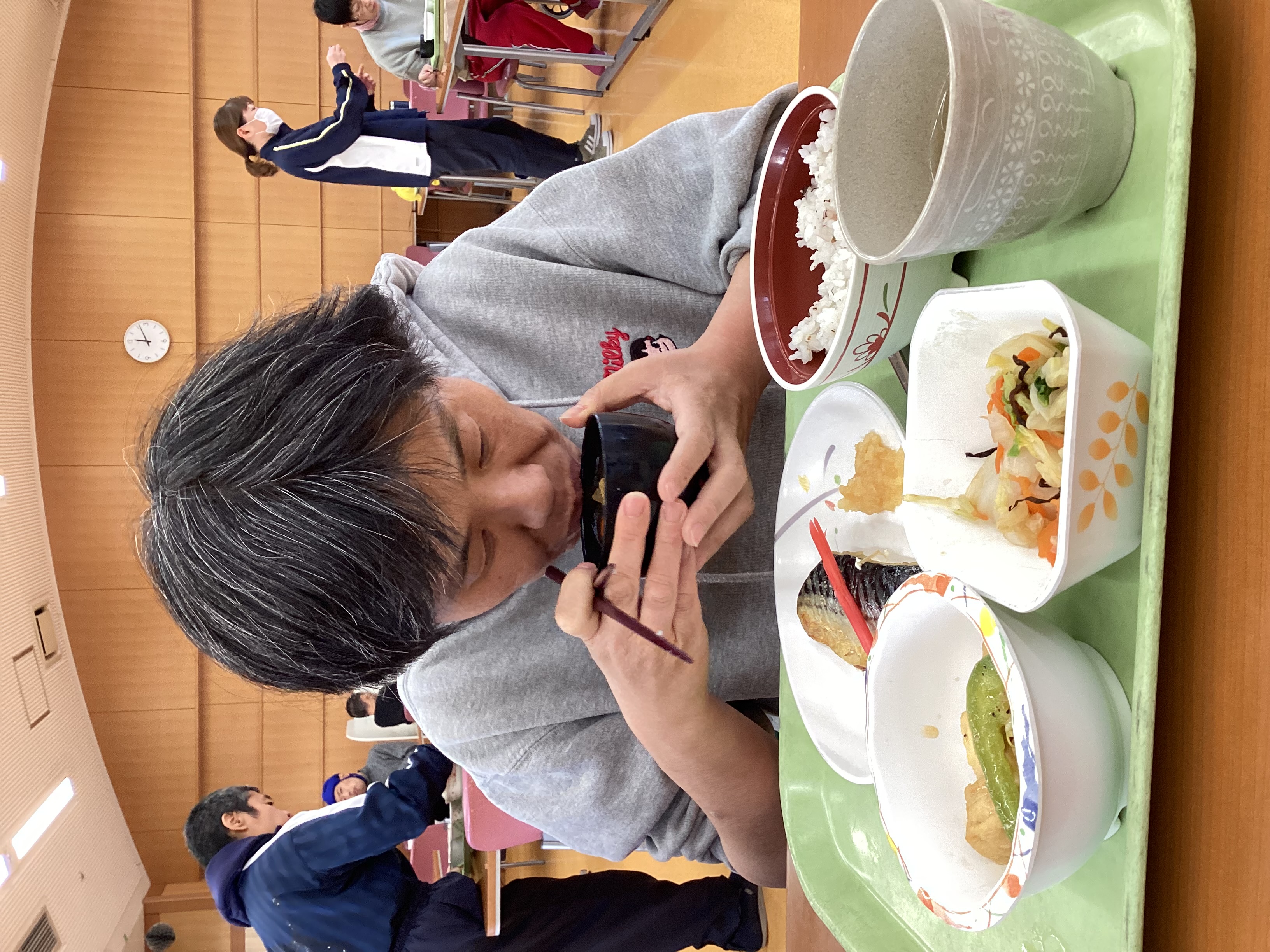 今日はお楽しみ行事で具だくさんの豚汁が振る舞われました。弥富の里では、野菜を作り施設やイベント行事等で売っています。今日は自分たちで作った大根なども具材に入って、栽培、収穫、食事と自分の口に運ばれてくるまでの一連の流れを身をもって体験することができました。