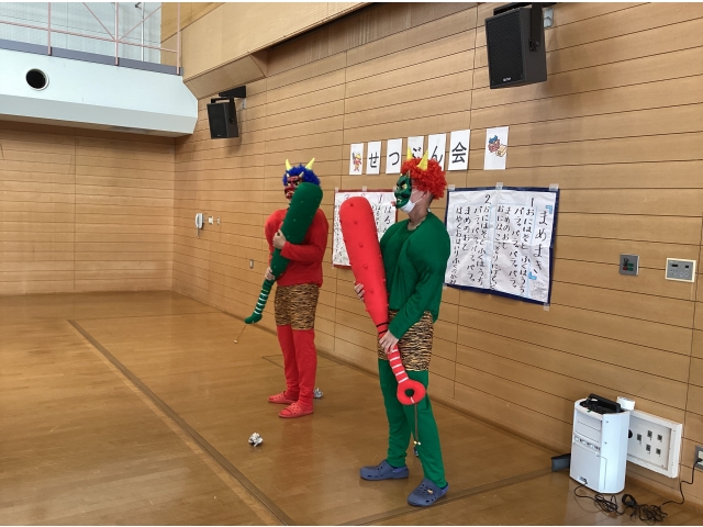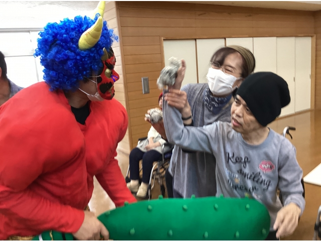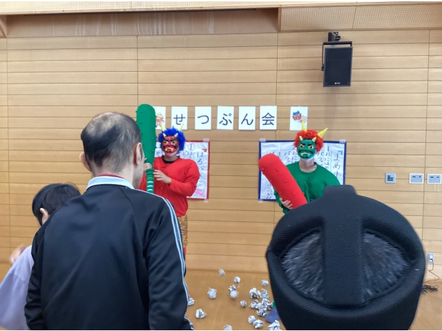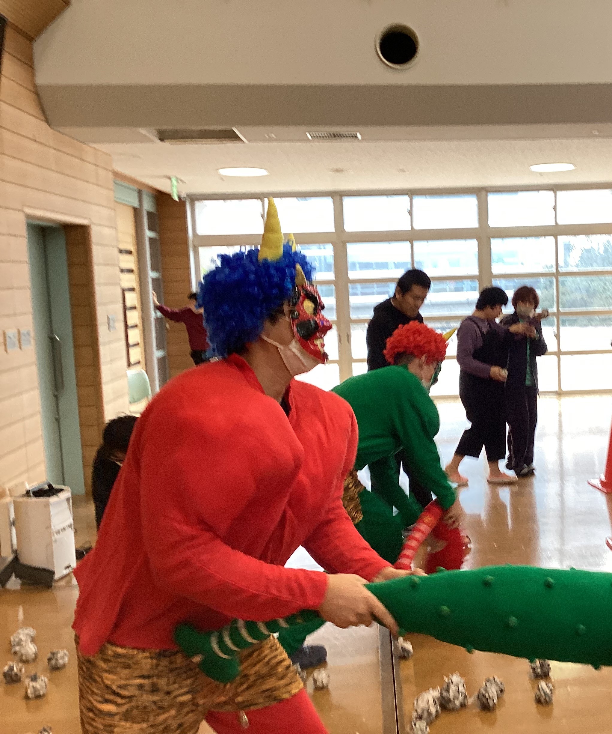 🎵おにはそと~。ふくはうち~。パラッパラッパラッパラッ豆の音~🎵 節分の歌を利用者さんと職員みんなで楽しく歌いました。豆を利用者さんに新聞紙を丸めて作ってもらい節分の準備をしました。当日はその新聞紙で作った豆を鬼に投げていました。その後甘納豆を食べて1年間の幸せを祈りました。