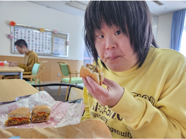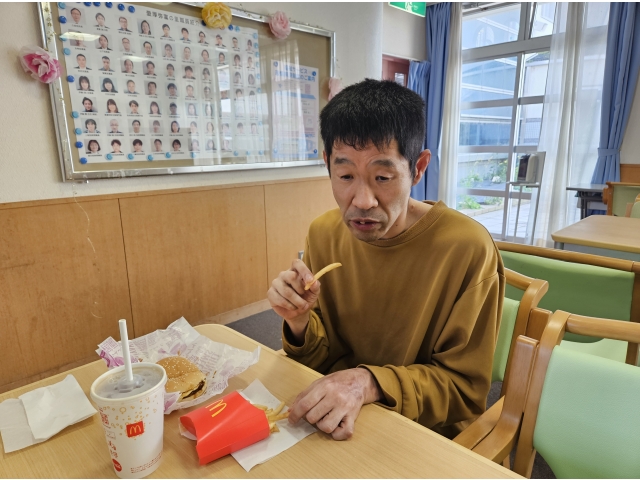 みなさん今日のお昼は何を食べましたか?今日は余暇外出で車に乗り、マックでハンバーガーを購入しました。 ハンバーガーにポテト、ジュース… いいなぁ~、おいしそう(o^―^o) ごちそうさまでした!! 生活支援班