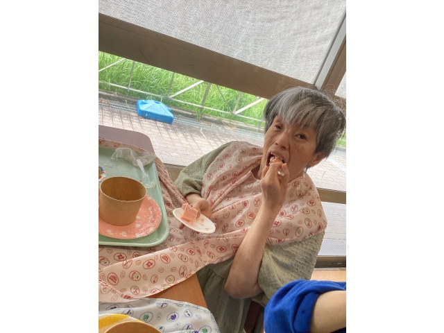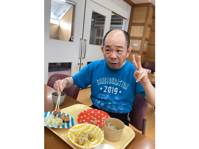 6月21日に昼食バイキングがありました。 皆さん朝から「バイキング!バイキング!」とワクワクしている様子・・・ピラフ、ハムカツ、チキンなど、いろいろなおかずがのっており、皆さん笑顔で楽しく召し上がっていました。食べ終えた後は、「おいしかった!」と大満足の様子でした。 次の昼食バイキングでは、何が出るのか楽しみです。 生活支援班