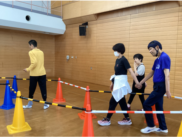 第二活動班は夏の間、外がとても暑い為、室内歩行を行っています。 室内で行う際は、利用者さんと一緒にコーン等を円になるように準備し、その周りを歩いています。今回は気分を変えて、コーンをジグザクに置き、迷路のようにしてみました。最初は戸惑いの様子もありましたが、すぐに慣れきて、迷路のコースを楽しんでいました。 生活支援班