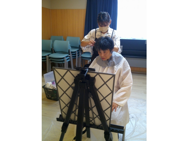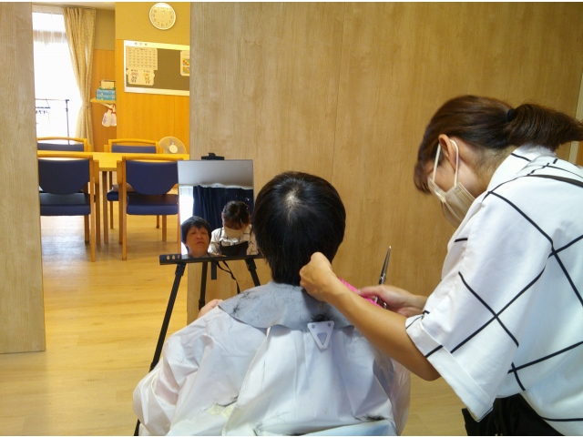 職員の都合もあり、地域の散髪屋、美容室に行けない方のために、訪問美容をお願いしています。ホームに来てもらい、慣れた場所で好みのスタイルに変身します。カット中は美容師さんに一方的に話しかけていますが、笑顔で相槌をもらっています。髪型も決まり、話もできて大満足です。