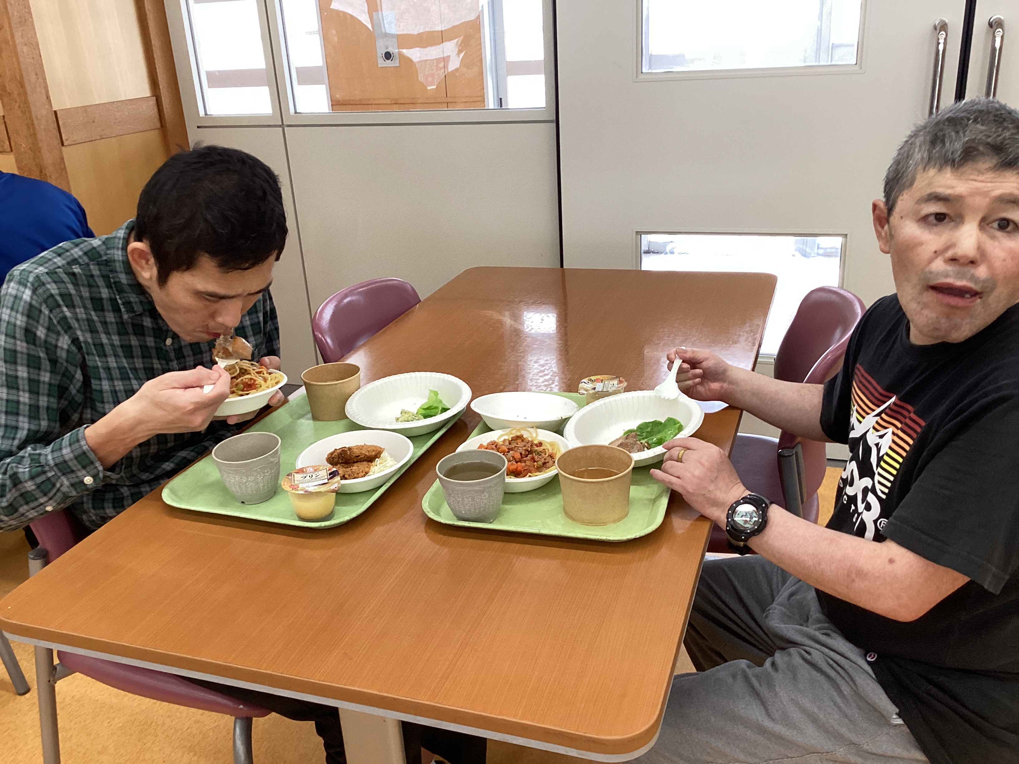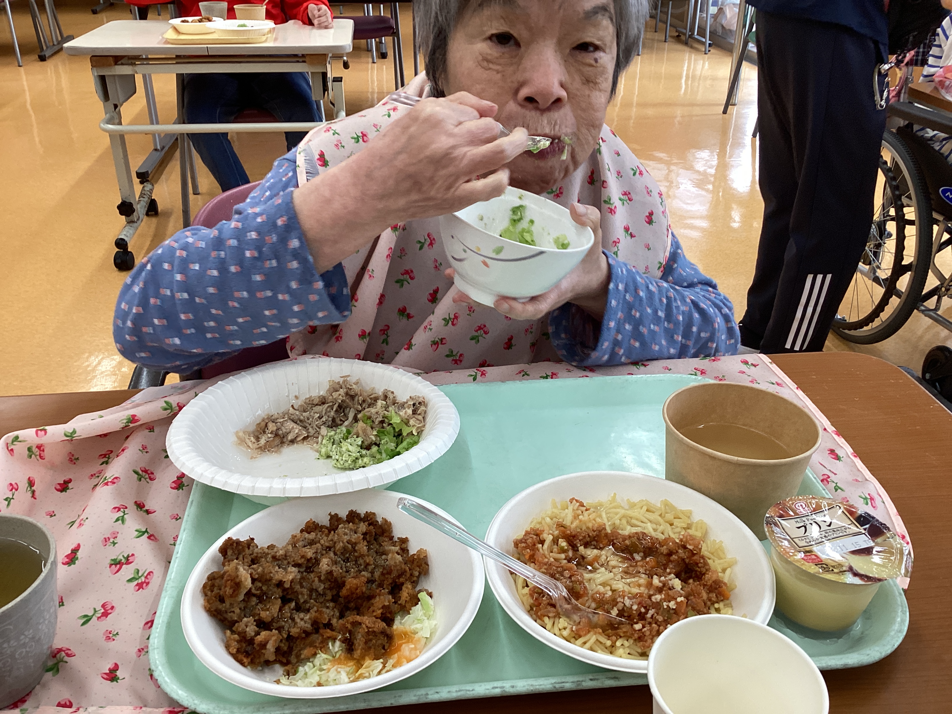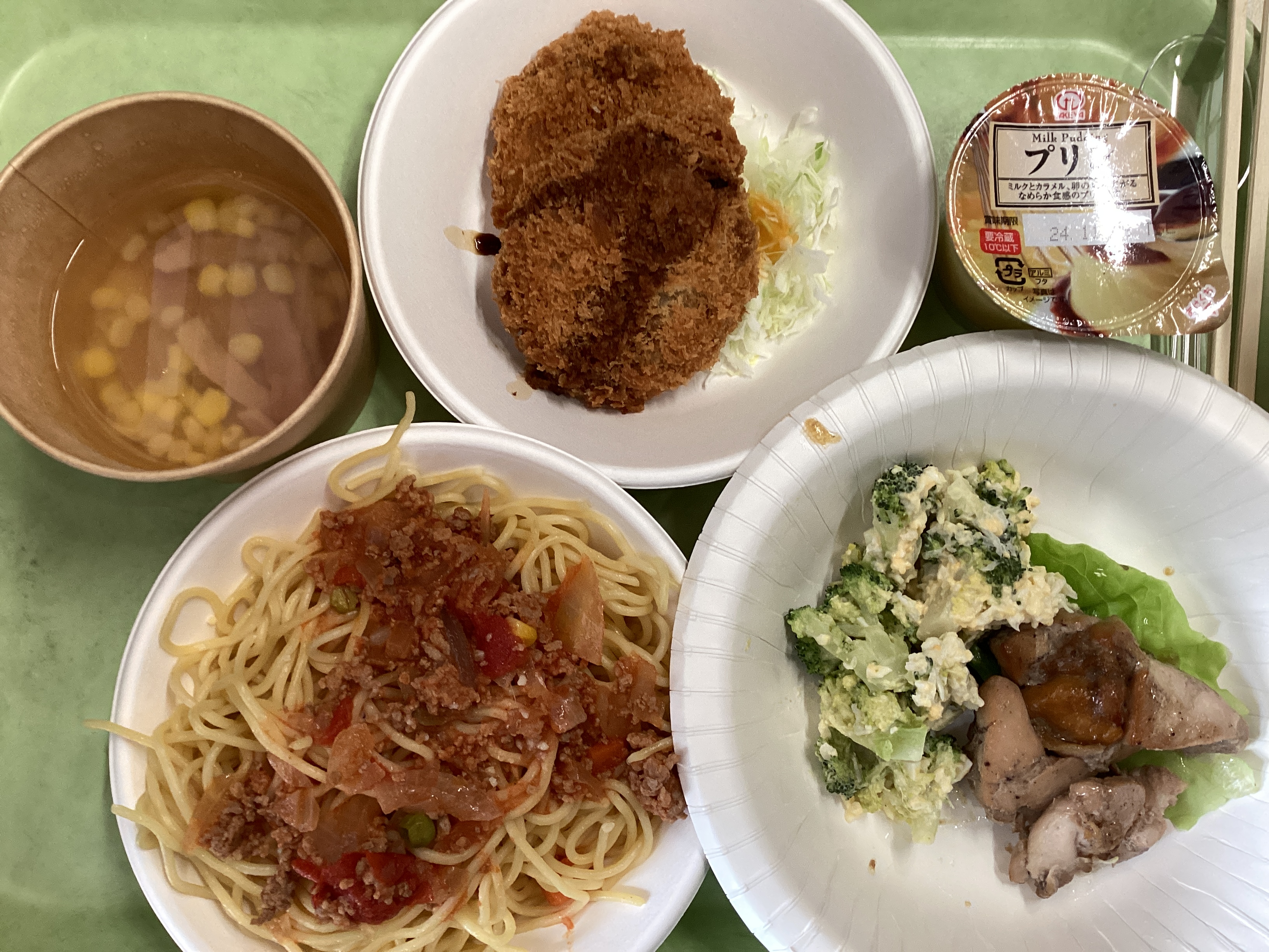 利用者さんの大好きな昼食バイキングが行われました。メニューはミートパスタ、 スパイシーチキン、メンチカツ、コンソメスープ、ミモザサラダ、プリンでした。 みんな美味しそうに食べられていました。 とくにメンチカツとミートパスタが美味しかったようです✨麺類が好きな利用者さんがとても笑顔で食べられていました。(^^♪