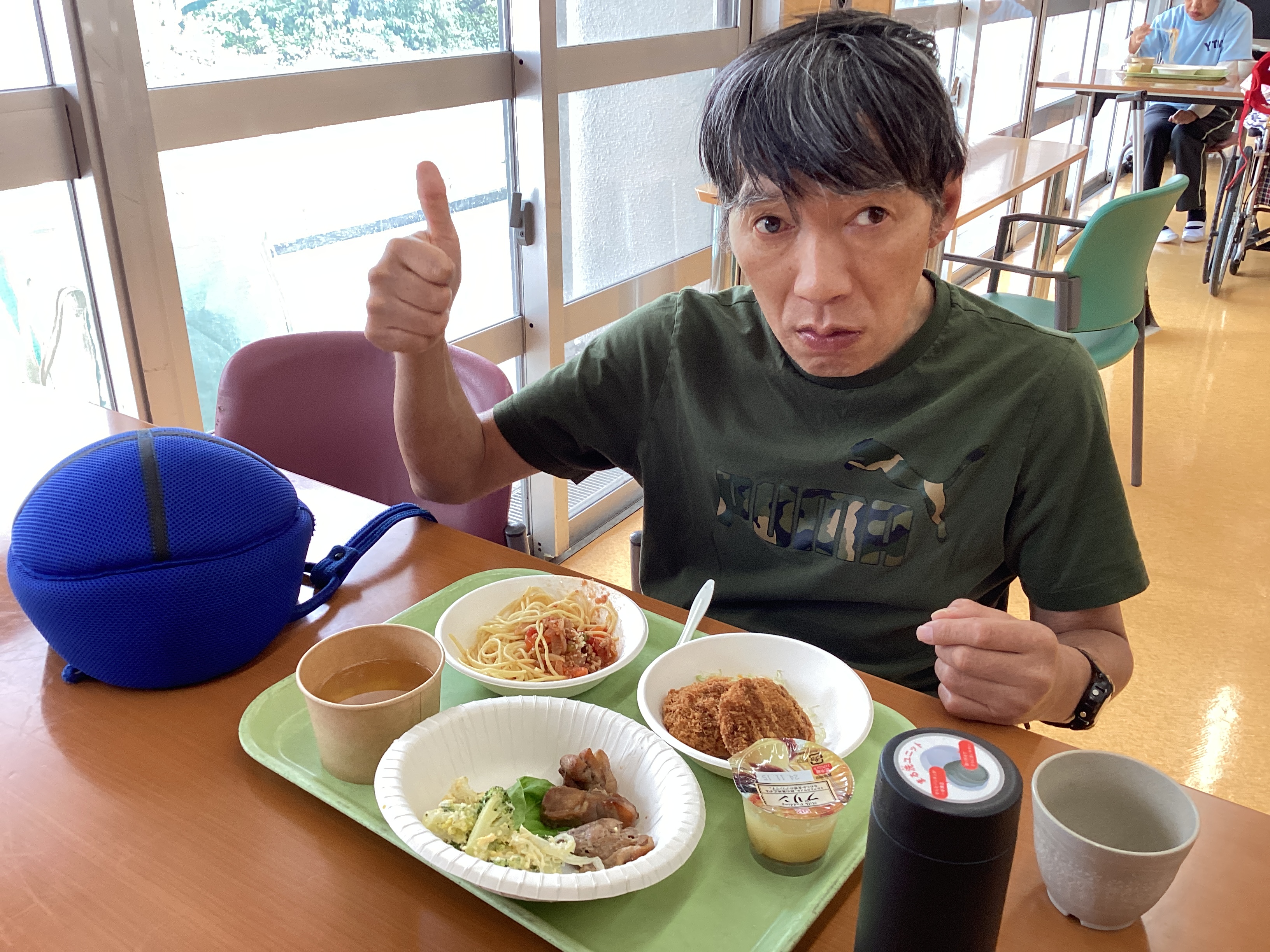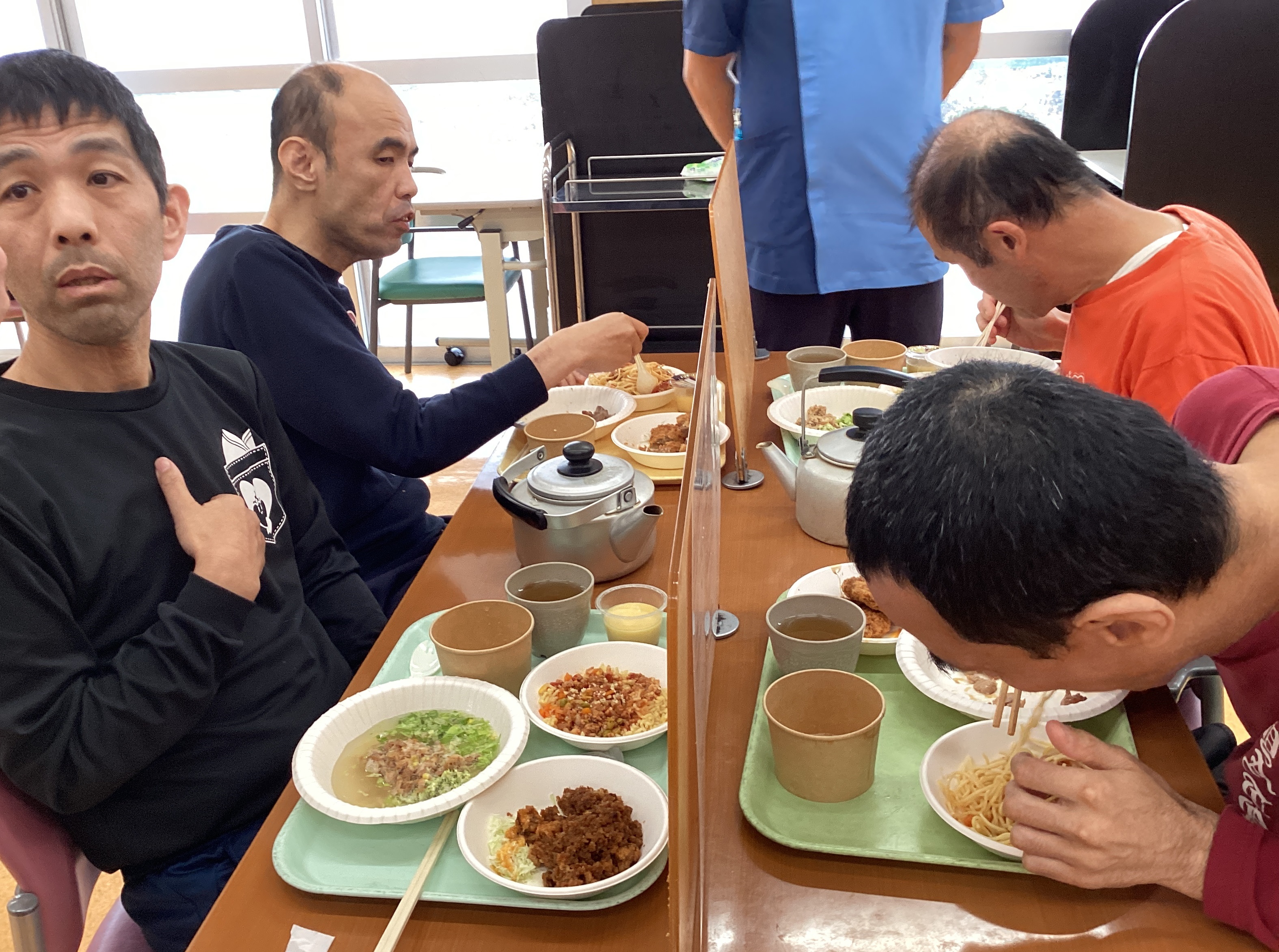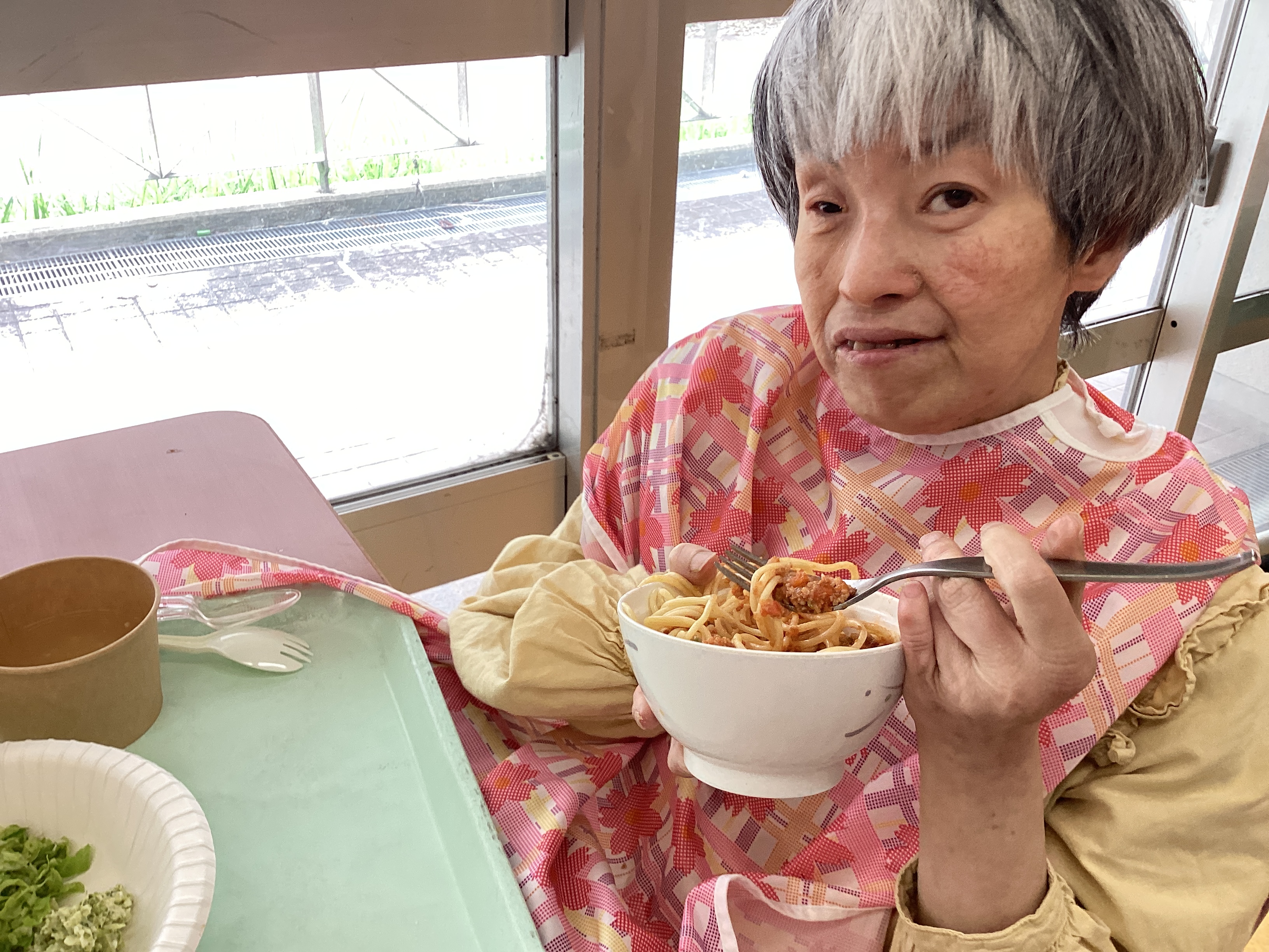利用者さんの大好きな昼食バイキングが行われました。メニューはミートパスタ、 スパイシーチキン、メンチカツ、コンソメスープ、ミモザサラダ、プリンでした。 みんな美味しそうに食べられていました。 とくにメンチカツとミートパスタが美味しかったようです✨麺類が好きな利用者さんがとても笑顔で食べられていました。(^^♪