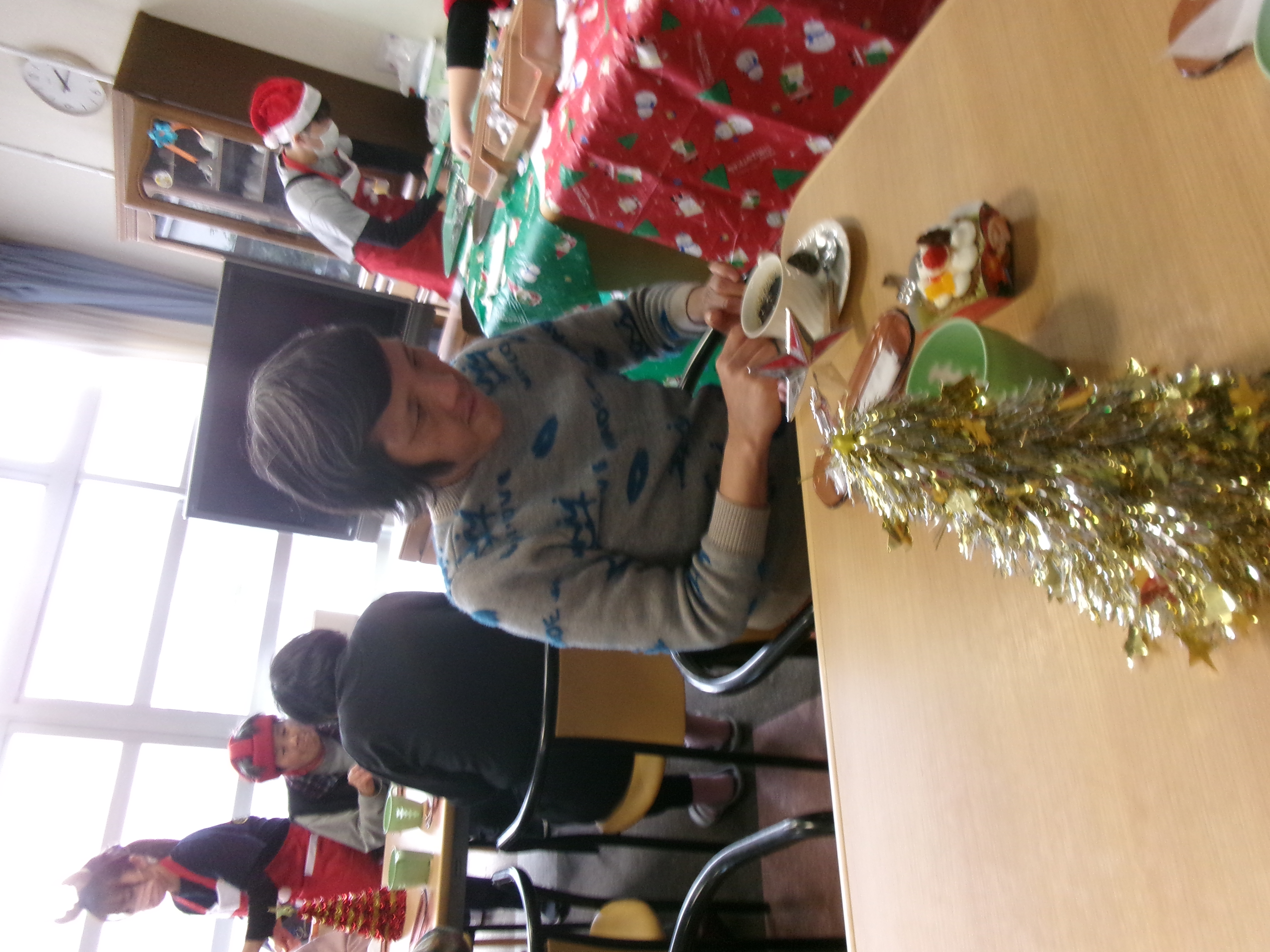 12月22日にクリスマス会を行いました🎅 前日にティールームの飾り付けを行い、当日は職員もクリスマスの装いをして会を迎えました(๑•̀ㅂ•́)و✧。 利用者の皆さんも、前日から大変楽しみにされており、当日は会場の飾り付け見て、美味しいケーキやジュース・コーヒーを召し上がって楽しまれ、たくさんの笑顔が見られました(❁´◡`❁)!