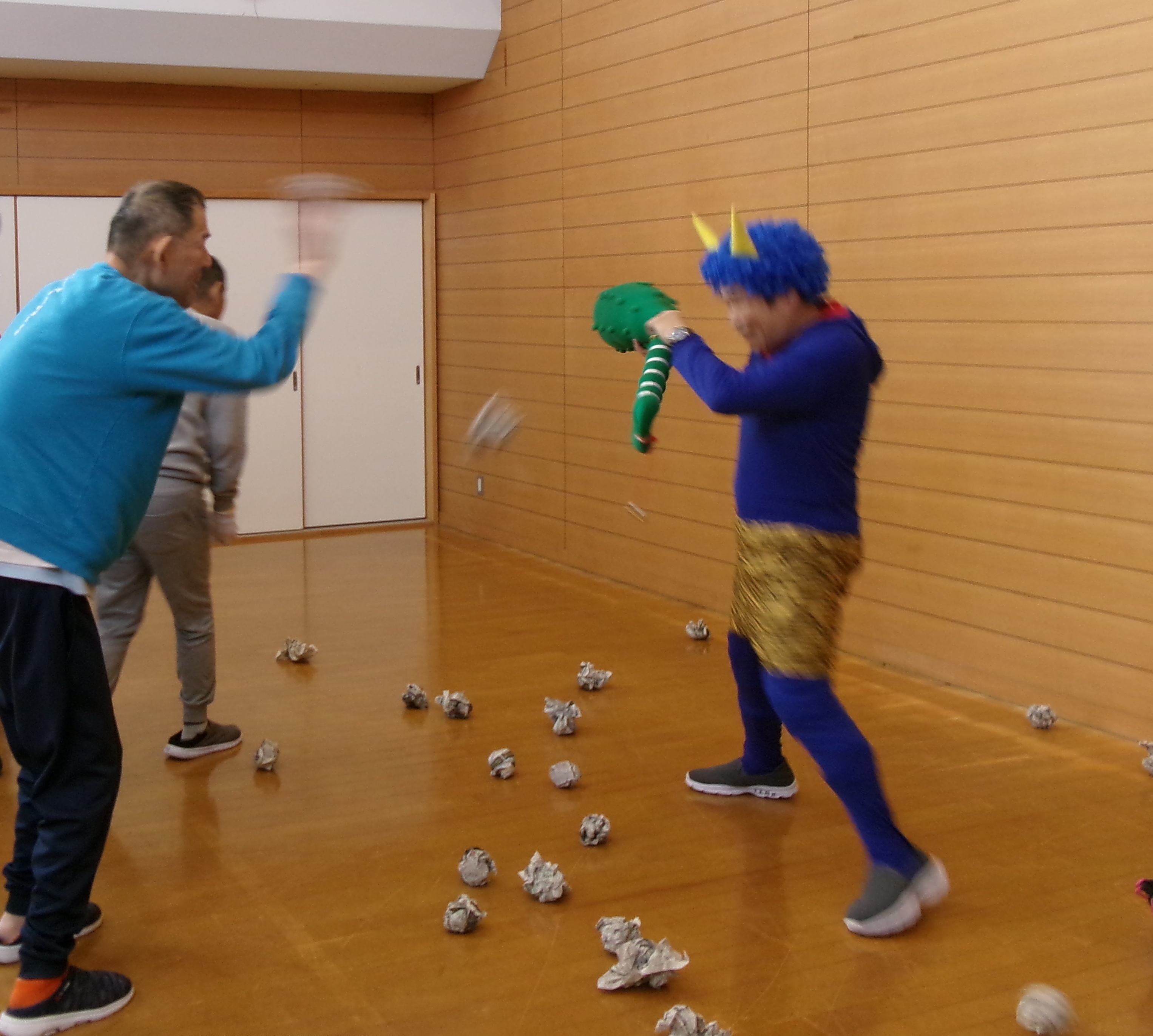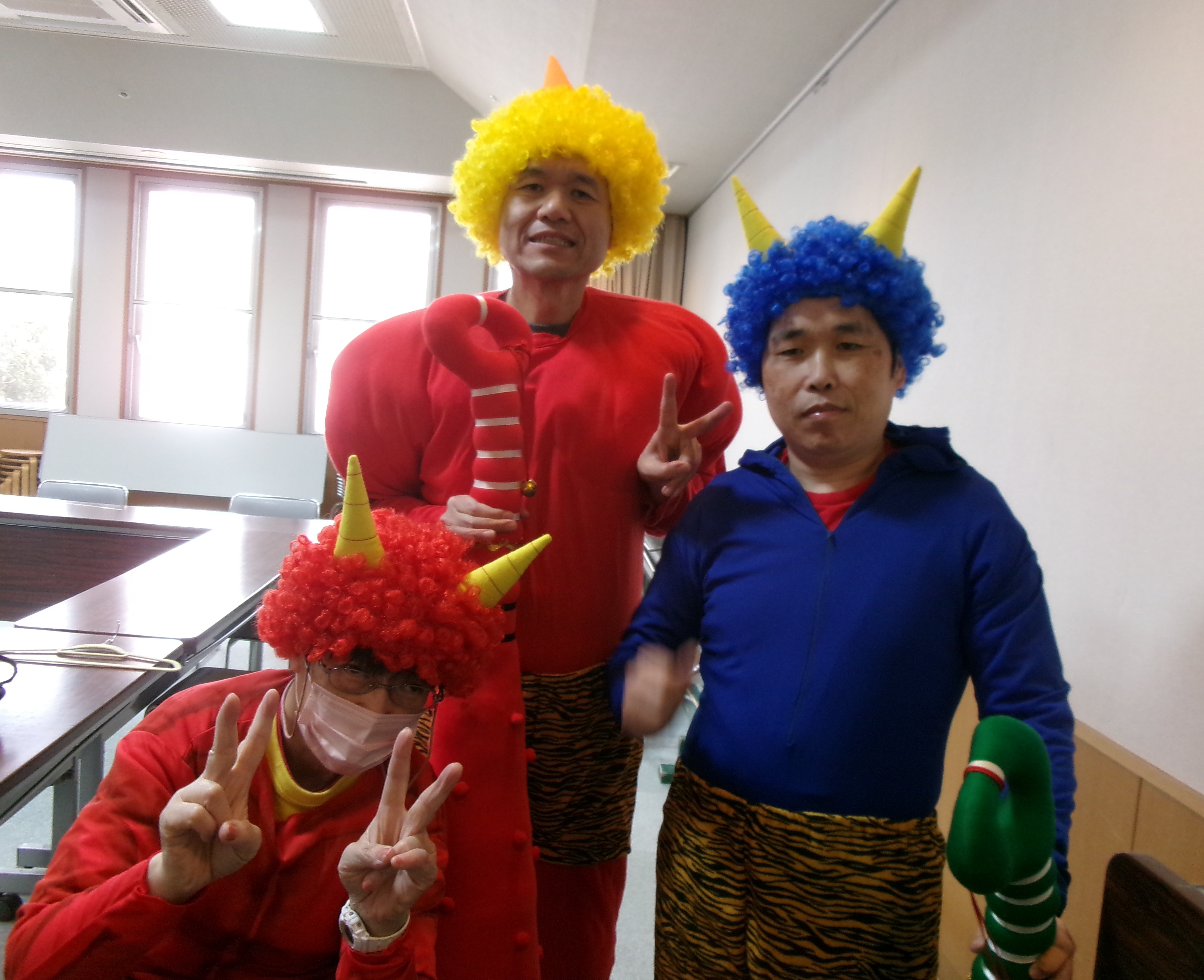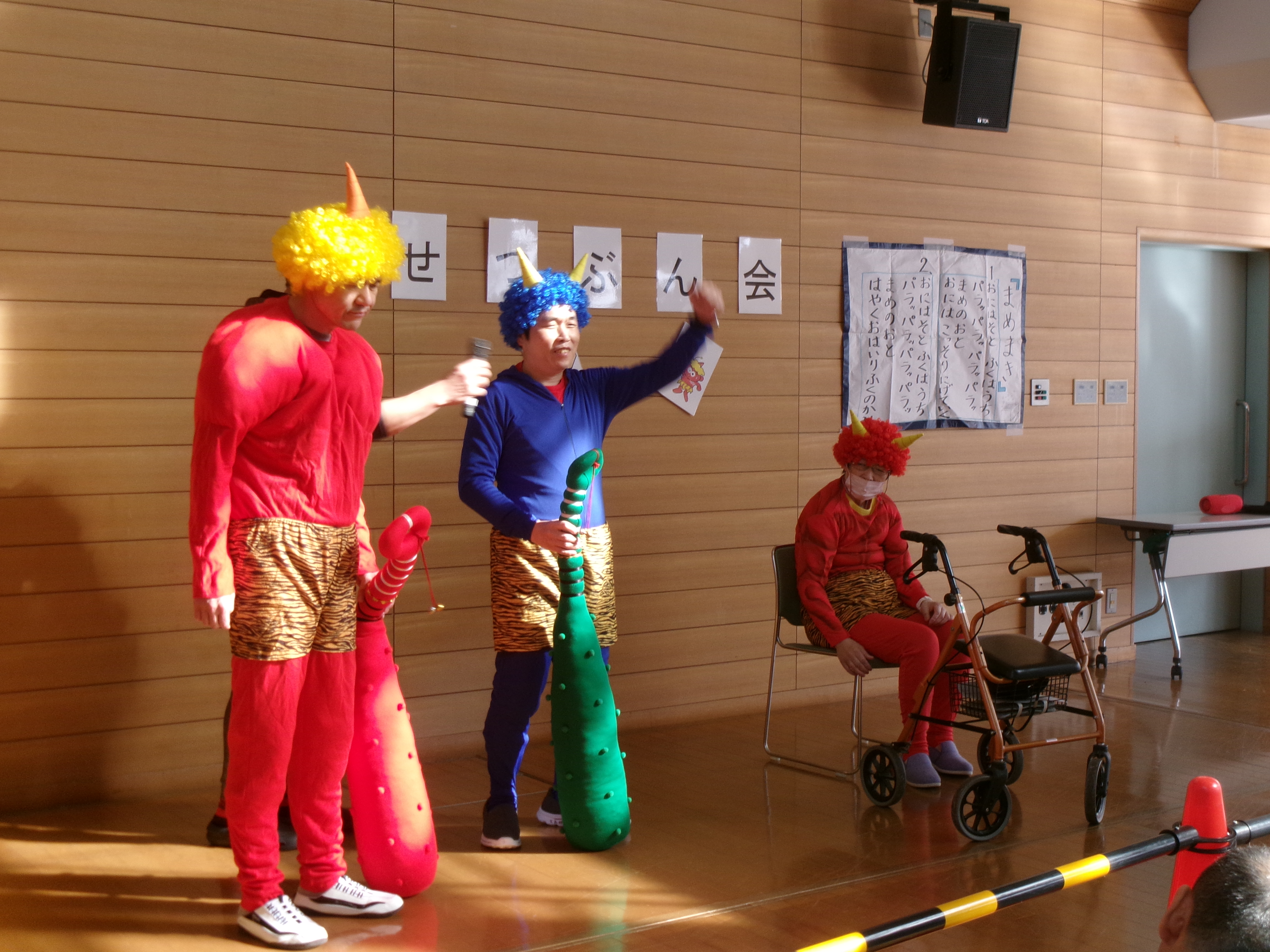 2月6日に節分会を行いました!今年は例年と違い鬼役を職員からではなく、やりたい人を利用者さんの中から募り、当日の鬼役をやっていただきました😊鬼役にインタビューをした後はいよいよ豆まき‼️丸めた新聞紙を豆に見立て、鬼に向かって皆で投げ節分を楽しみました🤾。 3人の鬼役の方達も衣装・カツラを身に纏って鬼になりきり大いに節分会を盛り上げてくれました🤣🤣。終了後に皆でジュースと一緒に甘納豆を食べ、節分会を終えました🥤🫘。