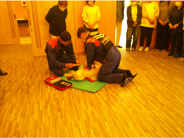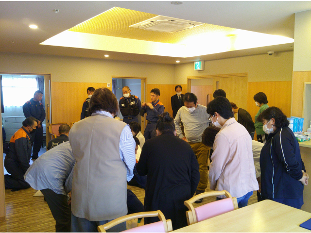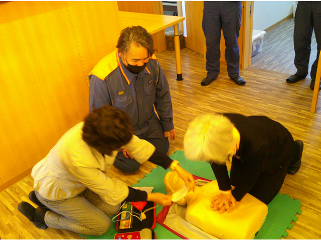 グループホームでは世話人に集まってもらい、定期的に会議を行なっています。今回は海部南部消防本部にご協力いただき、AEDの使用方法を学びました。人のやり方を見て「できる」と思っても、いざ自分の番になると焦って先走ってしまうことも。皆さん真剣に取り組んでいました。研修後は、各ホームに分かれて現在の課題などを話し合い、今年度も頑張ろうと意欲を高めることができました。