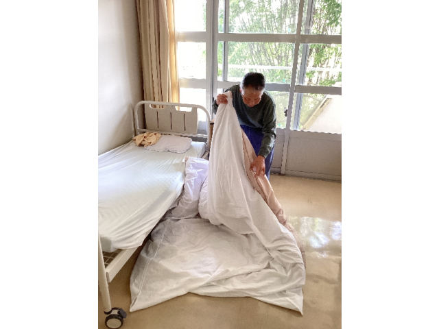 次は、部屋で掛け布団をきれいに畳もうとされているHさん。