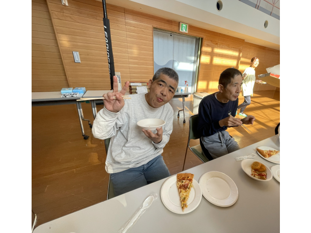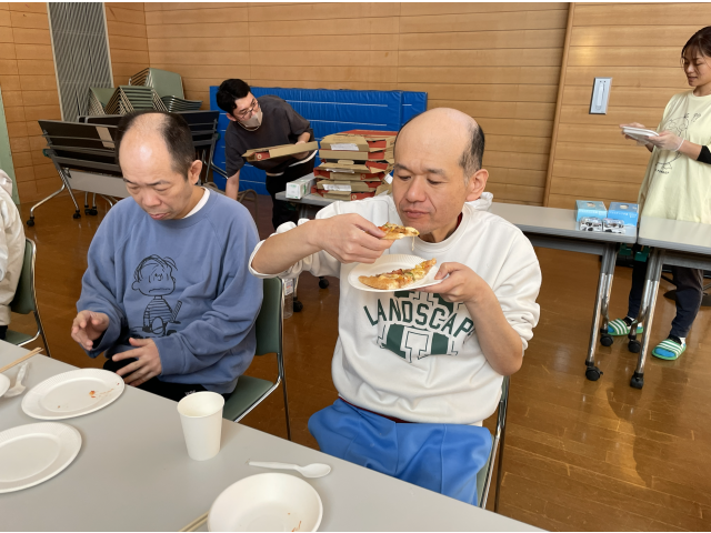 12月25日に第一活動班のみなさんでお楽しみ会を開催!1年間、活動を頑張ってきた皆さんと一緒にピザパーティーを行いました。 色んな味のピザがあり、どれもおいしそう。皆さんピザを片手に、楽しいひとときを過ごしました。 生活支援班