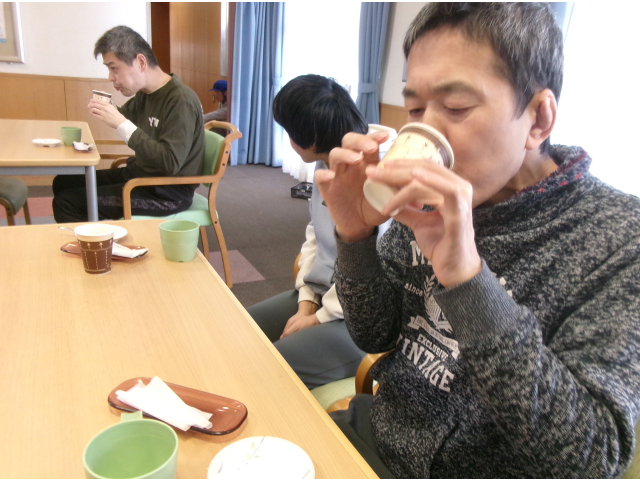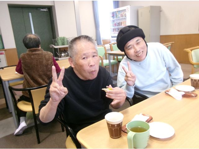 お餅の代わりに、食べやすいお麩や喉につまりにくい白玉など、管理栄養士さんと喫茶担当者が選び抜いた一品。利用者さんの中には『おかわりはないの?』と、いつも以上に賑やかな喫茶になりました。甘いものを食べると、幸せな気持ちになりますよね(^^)