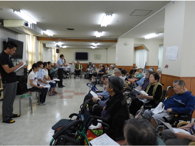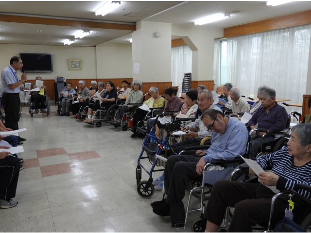 職員が声掛けする前から、食堂に向かわれる方、声掛けしたら、仲の良い方を誘って一緒に移動される方、配られた行事予定表を見ながら、自分の筆記用具を出してメモを取る方、少しウトウトとされながら聞かれる方、などなど参加のスタイルは、人それぞれでした。