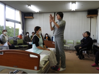 初任者研修における到達目標、評価の基準・国際生活機能分類(ICF)とはを座学で教わり、実技で利用者を小さくする・仰臥位から側臥位 側臥位から端座位 端座位から車椅子や椅子への移乗・スライディングシートの活用を演習で学びました。