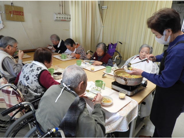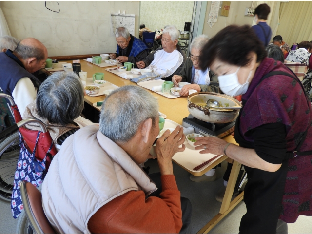 2/6(火)昼食時に塩ちゃんこ鍋を提供しました。萩原グループ(ボランティア)の方にもお手伝い頂き、利用者の皆様は笑顔いっぱいでした。普段小食の方は、いつも以上に箸が進み、いつも全量食べられる方はお替りすることができて、満足そうな表情でした。調理師さん・ボランティアさん、とても美味しい塩ちゃんこ鍋をありがとうございました。