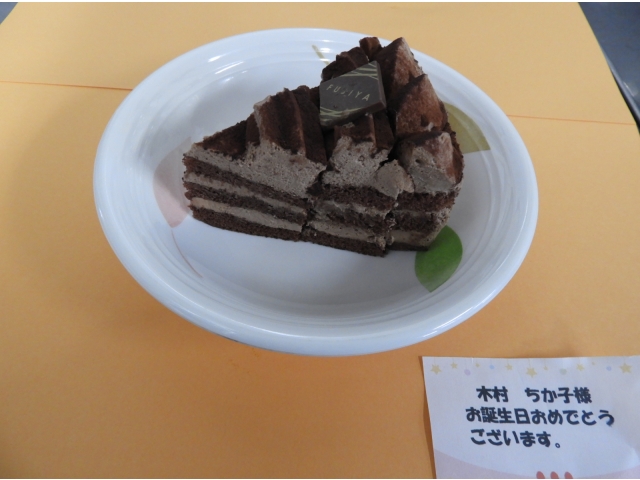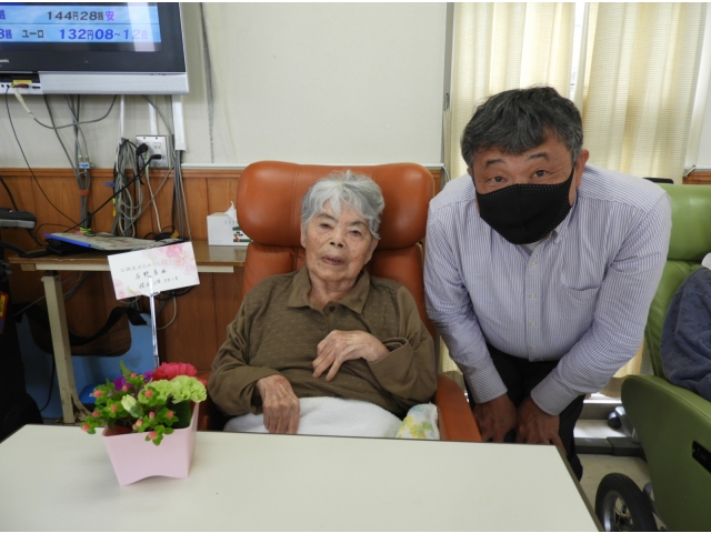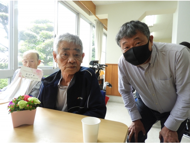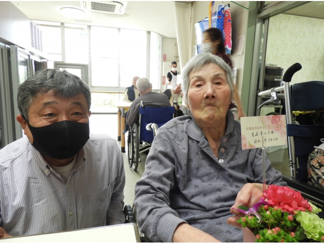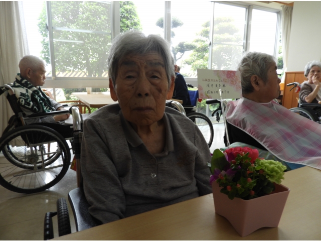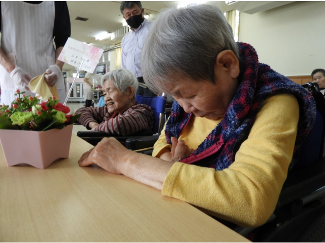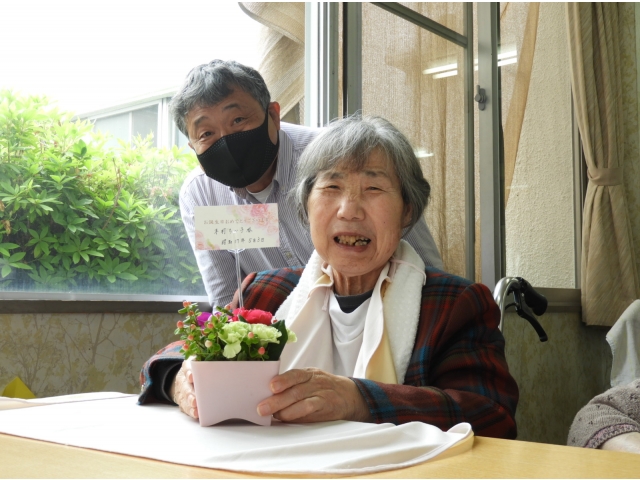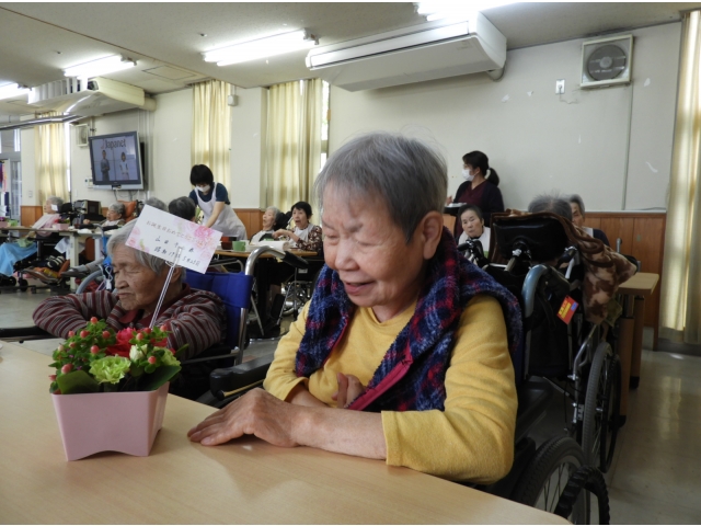 5月の誕生日を行いました。 今月は7名の利用者様が誕生日を迎えられました。一人一人にフラワーアレンジメントの贈呈と記念撮影を行いました。