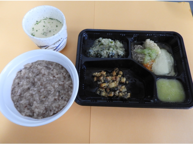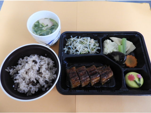 昼食ではいつもより少し豪華なメニューを提供しました。・赤飯 ・うなぎの蒲焼 ・炊き合わせ ・春雨の酢の物・茶碗蒸し ・ねりきり