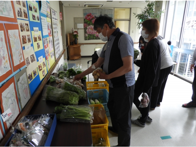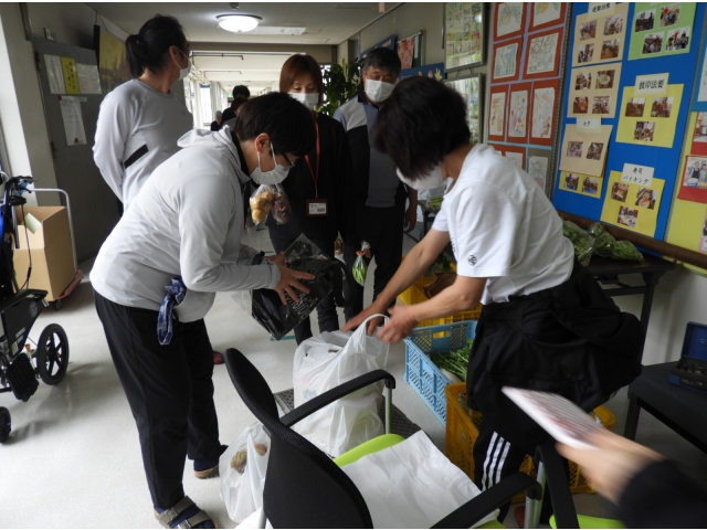 弥冨の里・就労継続支援(B型)さんが、育てた野菜や作成したグッズの販売のために来苑されました。 大根、玉ねぎ、小松菜、スナップエンドウ、レタス、ジャガイモに、手作りチェアー、カードケースやおなじみのハイドロカルチャーなどなど…