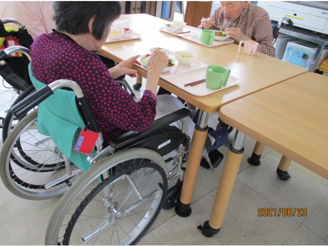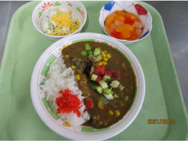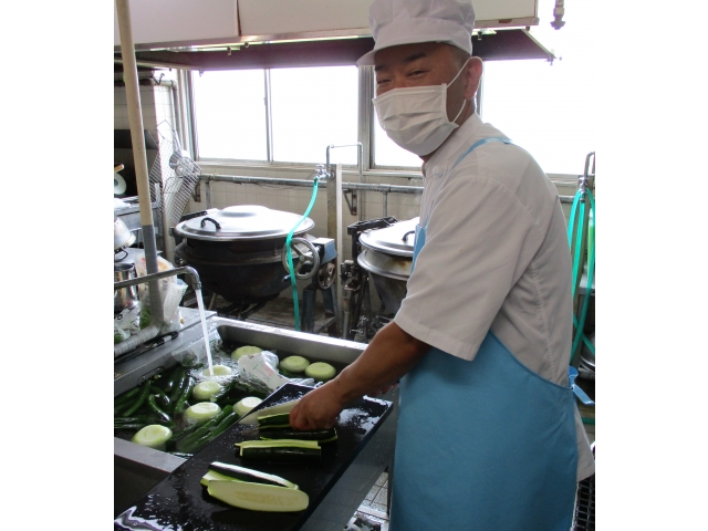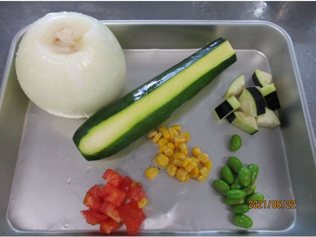 本日の昼食は人気メニューのカレーライスです。なす、トマト、ズッキーニ、枝豆、とうもろこし・・・沢山の夏野菜を仕込みます。