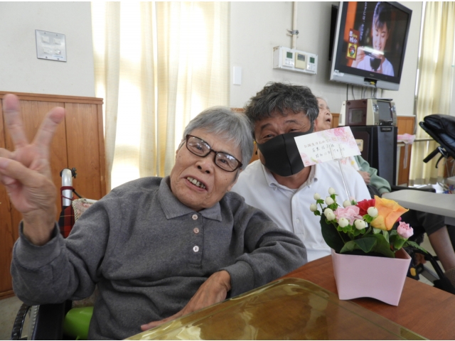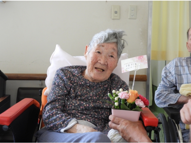 フラワーアレンジメントを贈呈し、記念撮影を行いました。今月の誕生会のメニューは