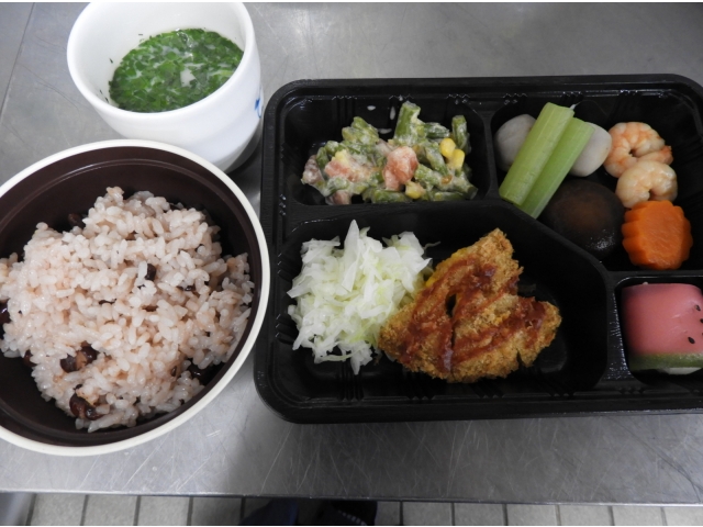 赤飯・茶碗蒸し・メンチカツ・炊き合わせ・アスパラガスのシーザーサラダ風・スイカのねりきり