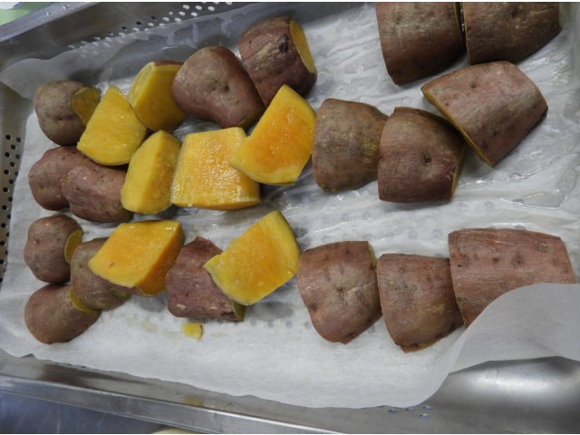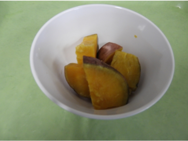食べやすいように切り分けます。また、極きざみ食・ミキサー食の方には安納芋ペーストを用意しました。