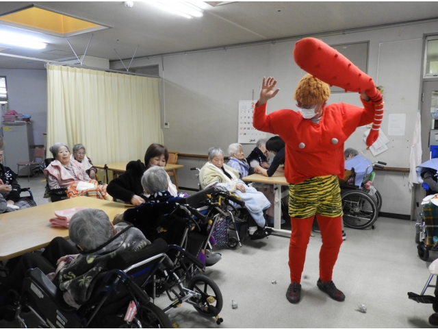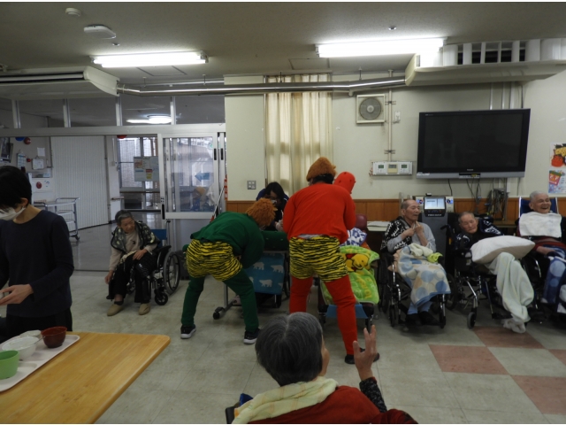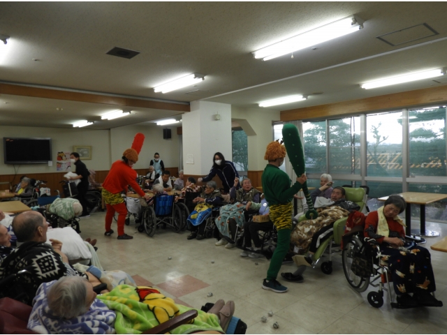 利用者の皆さんのもとへ突入すると、待ってましたとばかりに豆(ボール)を投げつける皆さん。