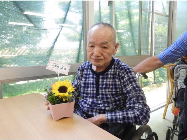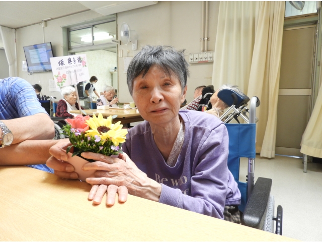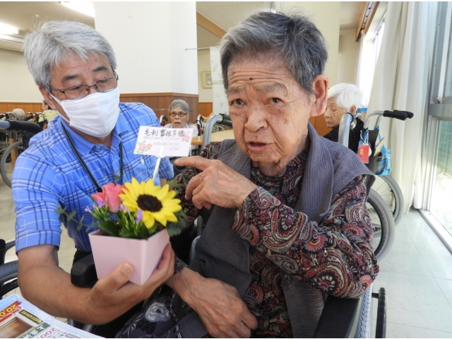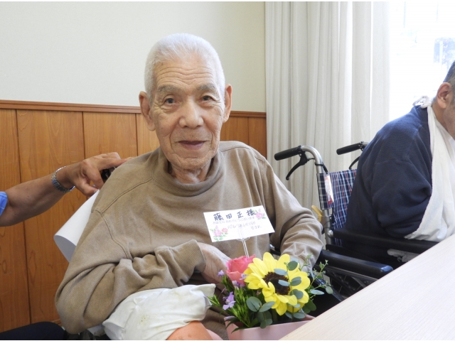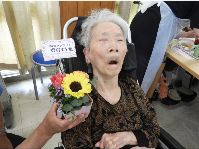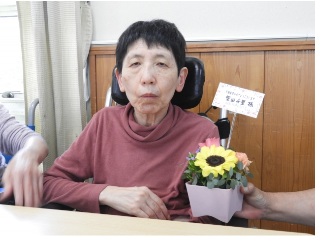6月9日(木)誕生会を行いました。 今月は8名の利用者様が誕生日を迎えられるということで、フラワーアレンジメントの贈呈や、記念撮影を行いました。