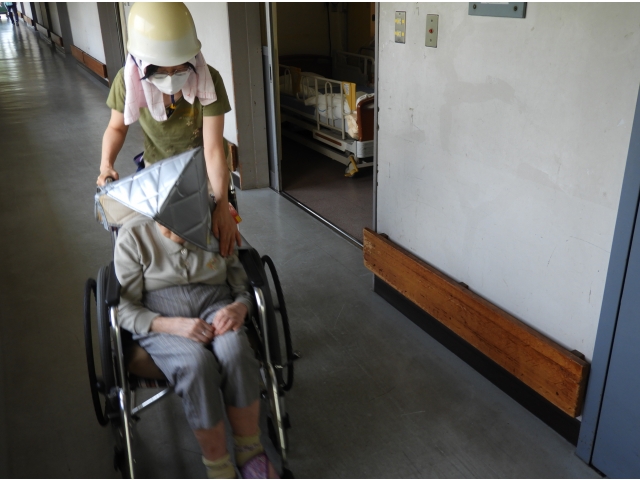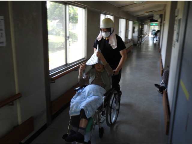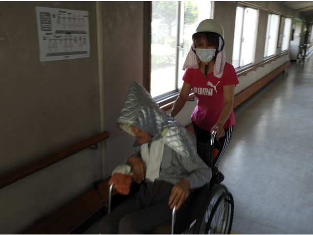 この日は朝から30度超えの気候ということで、避難場所を屋外→屋内に急遽変更して行いました。