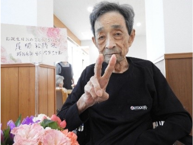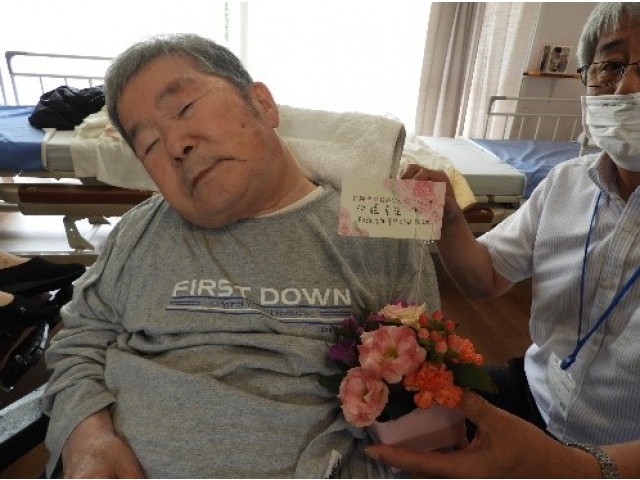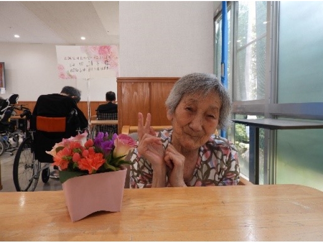 9月28日(木) 誕生会を行いました。今月は4名の利用者様が誕生日を迎えられ、フラワーアレンジメントの贈呈や、記念撮影を行いました。