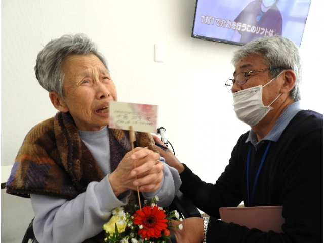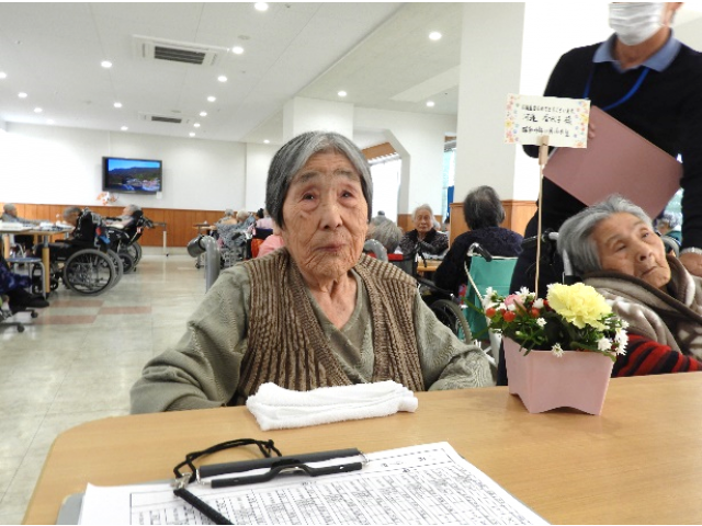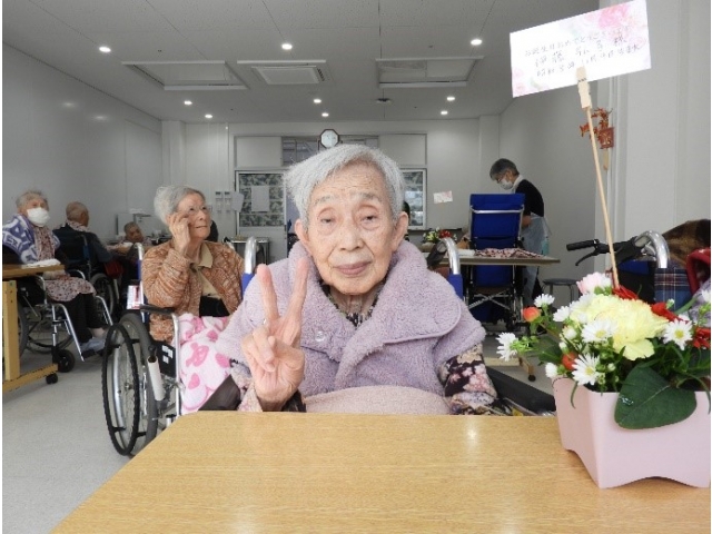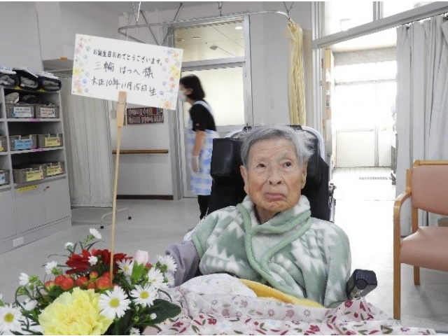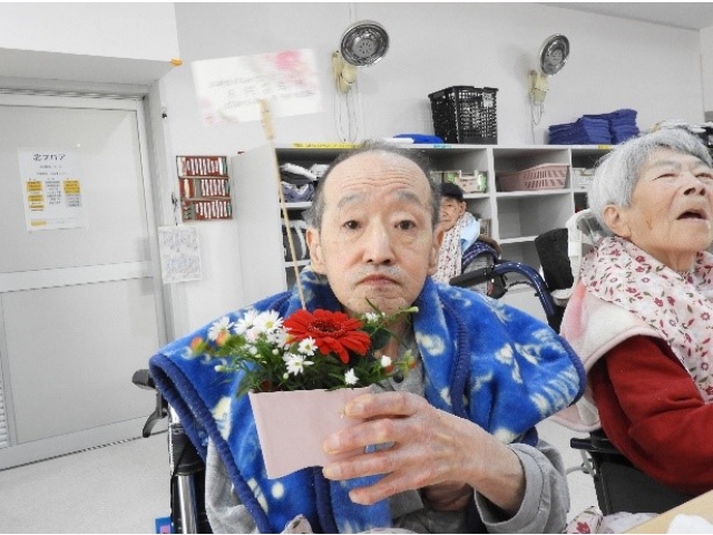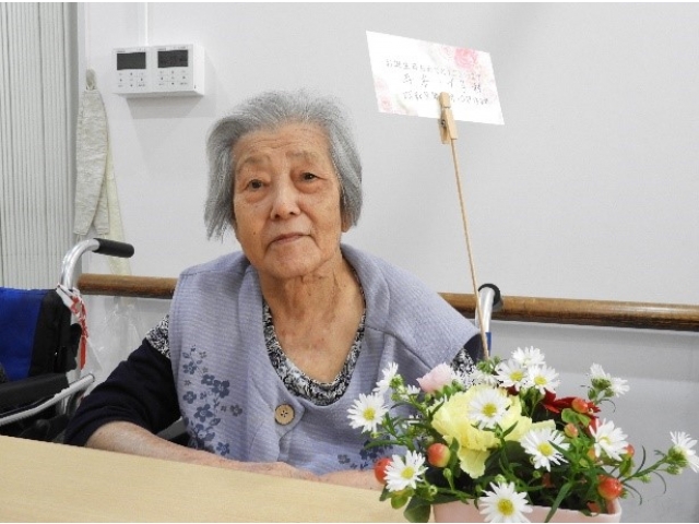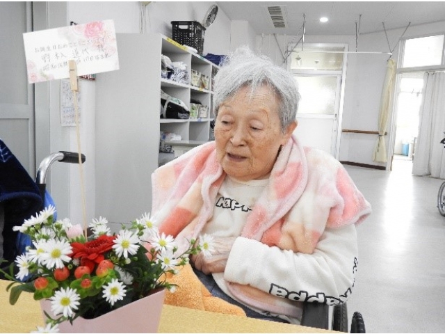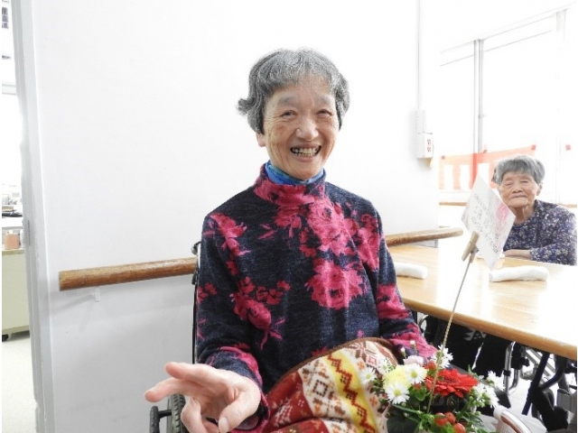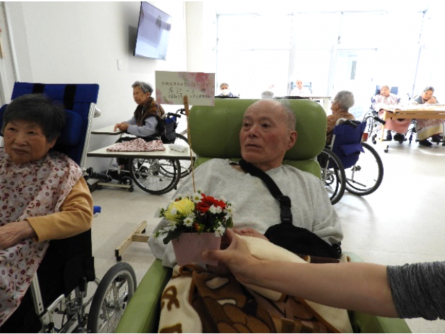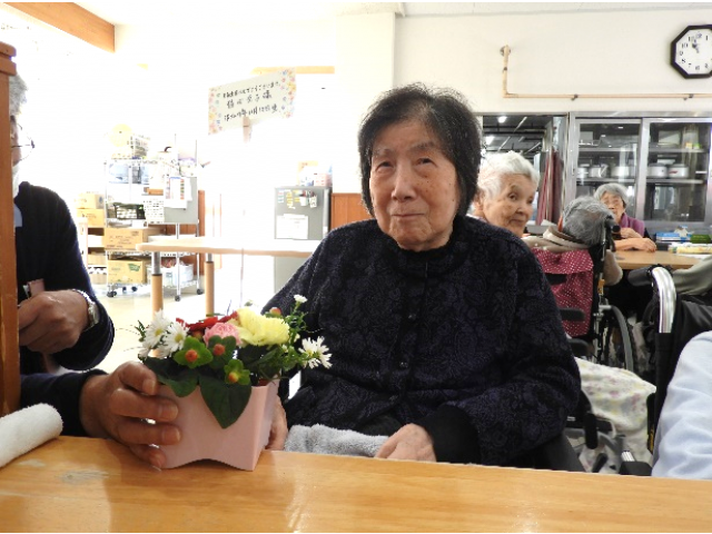11月9日(木) 誕生会を行いました。今月は11名の利用者様が誕生日を迎えられ、フラワーアレンジメントの贈呈や、記念撮影を行いました。