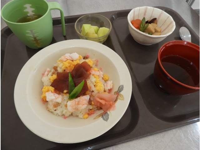 今回の誕生会メニューは 海鮮ちらし寿司、高野豆腐の炊き合わせ、お吸い物、メロン🍈でした。しかしこのちらし寿司の漬けマグロ、とても良い味でおいしかったのですが、「奈良漬か?」と訝しむ方がいたとか、いなかったとか…