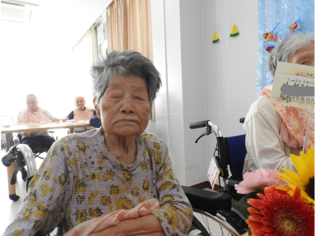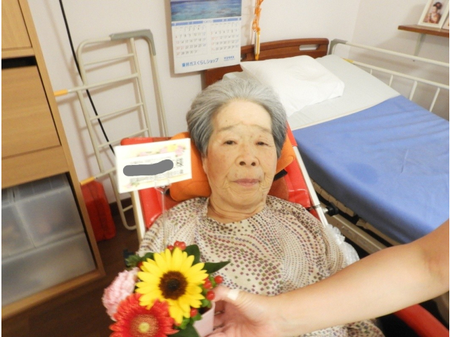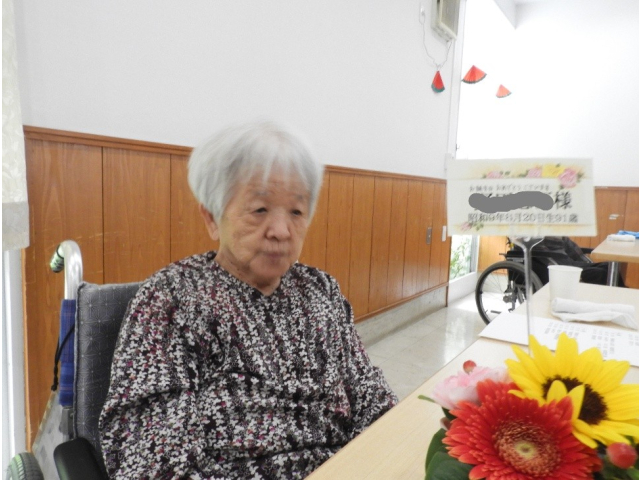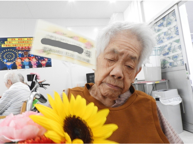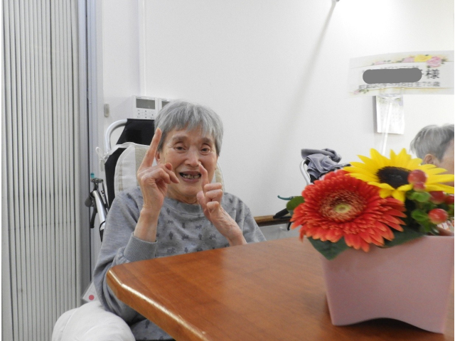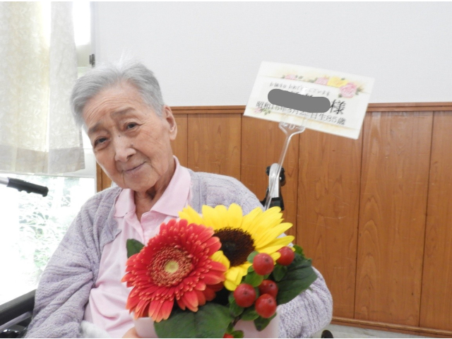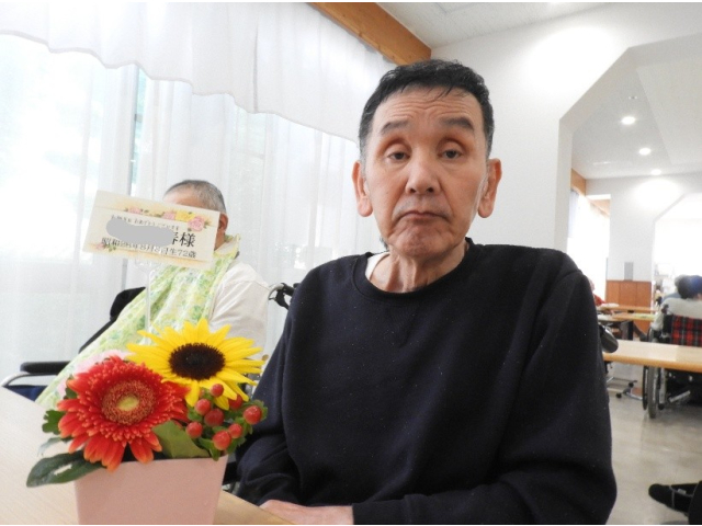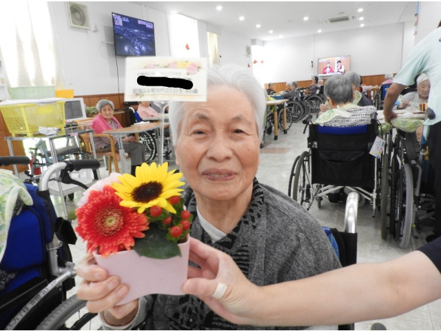 8月14日(木) 8月の誕生会を行いました。今月は9名の利用者様が誕生日を迎えられ、フラワーアレンジメントの贈呈や、記念撮影を行いました。