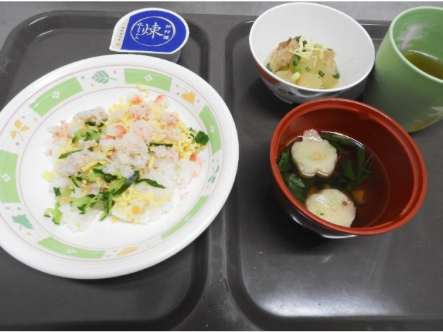 9名のうちお一人は入院中でしたので、退院後に改めてお祝いさせてもらいますね。 今回の誕生会メニューは ちらし寿司、冬瓜と豚バラの煮物、吸い物、水ようかんでした。