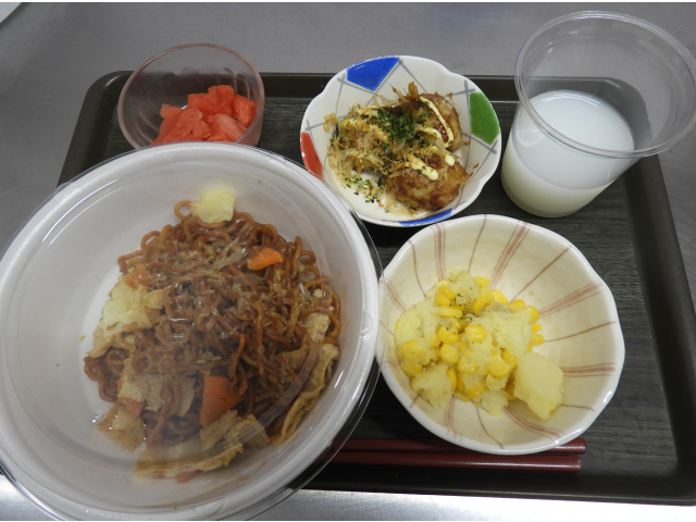 お昼ごはんは、焼きそば、たこ焼き、じゃがバターコーン、スイカ、ジュースです。ジュースはノンアルコールビール、カルピス、リンゴジュースからお好きなものを選んで飲みました。