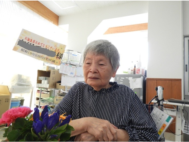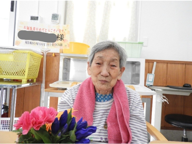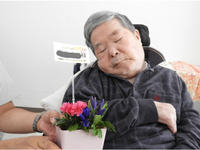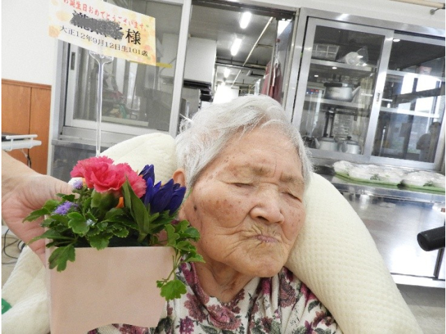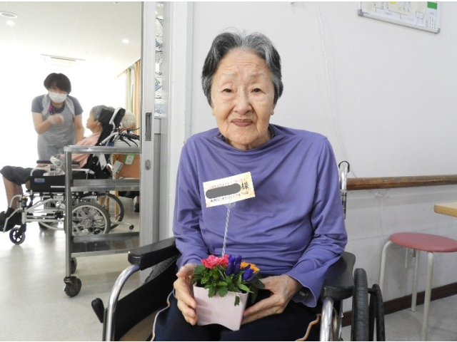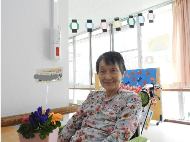 9月11日(木) 9月の誕生会を行いました。今月は7名の利用者様が誕生日を迎えられ、フラワーアレンジメントの贈呈や、記念撮影を行いました。