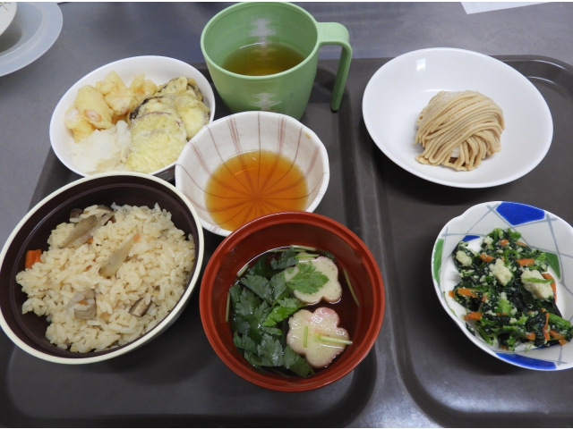 今回の誕生会メニューは 炊き込みご飯、エビ、南瓜、茄子の天ぷら盛り合わせ、ほうれん草の白和え、お吸い物、モンブランケーキと秋らしいメニューでした。みなさん、おめでとうございます!!