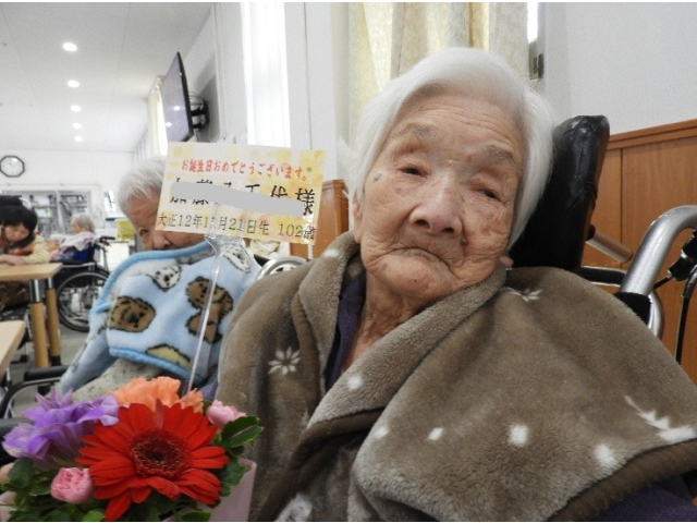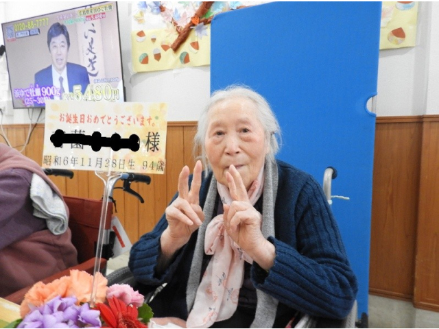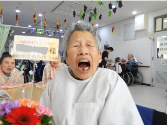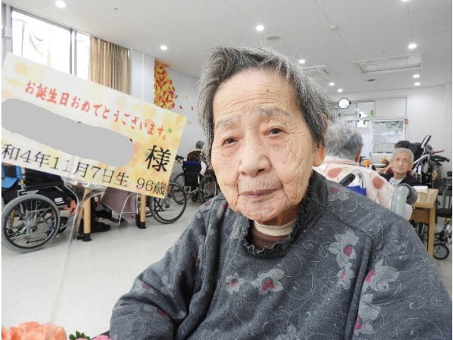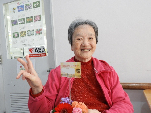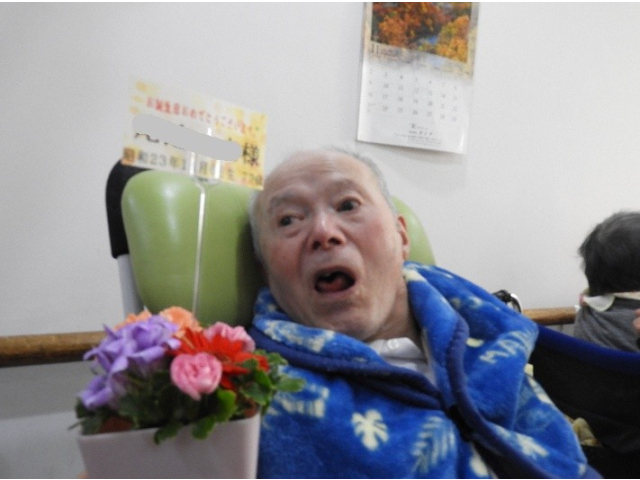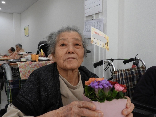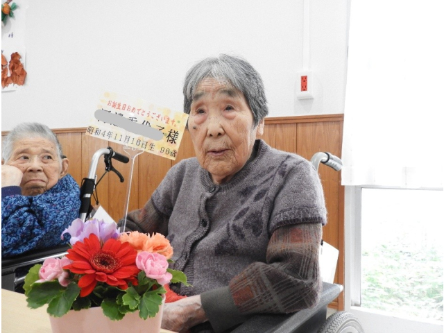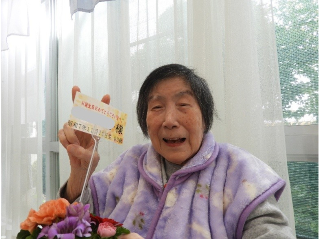 11月13日(木) 11月の誕生会を行いました。今月は9名の利用者様が誕生日を迎えられ、フラワーアレンジメントの贈呈や、記念撮影を行いました。