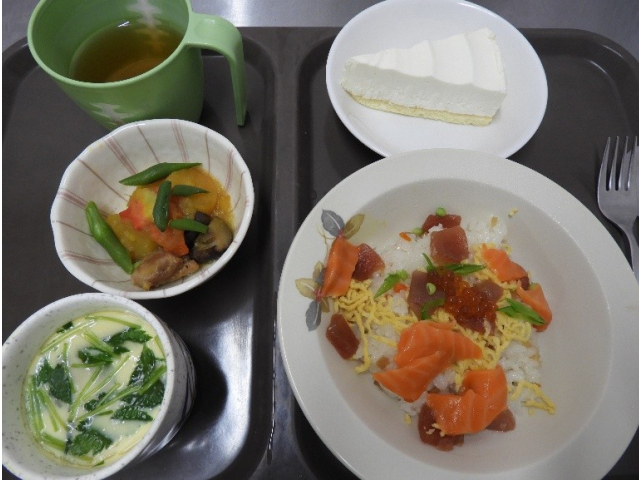今回の誕生会メニューは海鮮チラシ、秋の炊き合わせ、茶わん蒸し、レアチーズケーキでした。