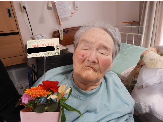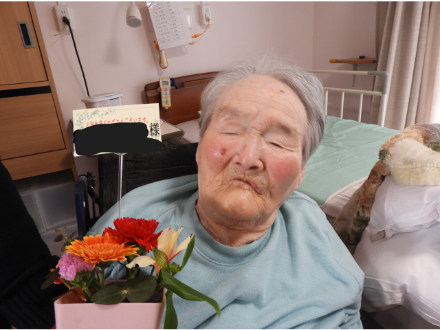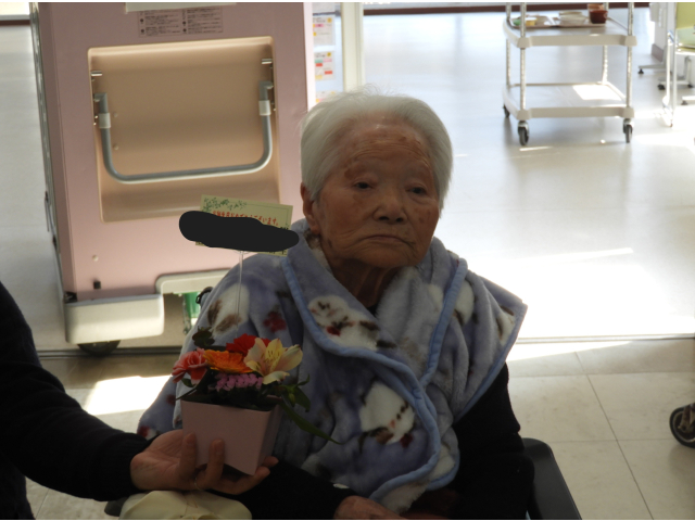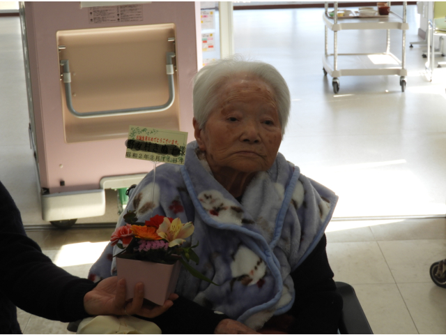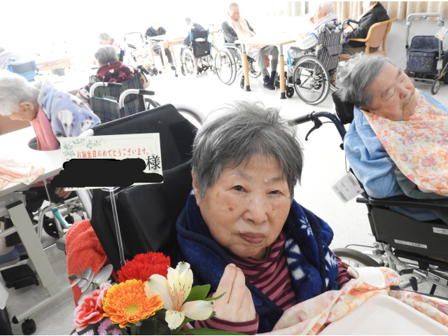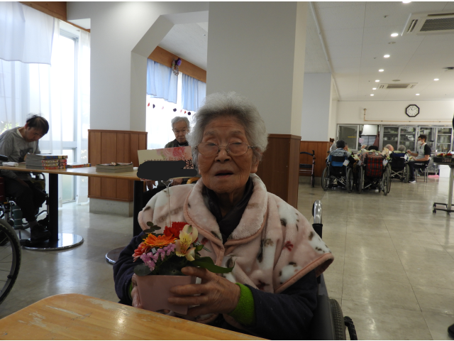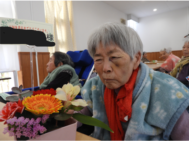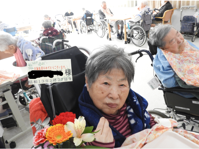 2月12日(木)2月の誕生会を行いました。今回は8名の利用者様が誕生日を迎えられ、フラワーアレンジメントの贈呈や、記念撮影を行いました。