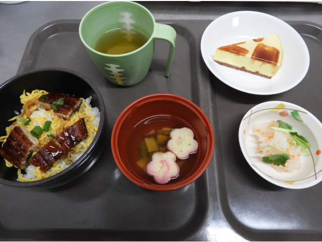 今日の誕生会メニューは鰻丼、三色なます、お吸い物、プリンケーキでした。