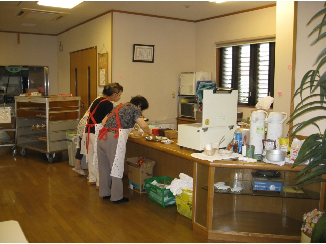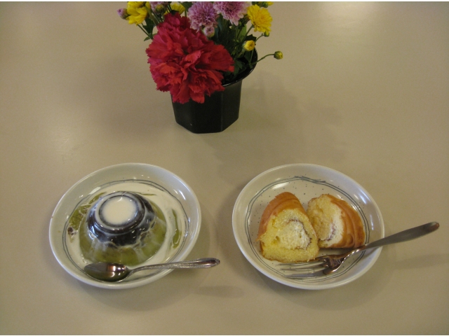 毎月3回、ボランティア「あかりの会」の方による喫茶があります。 6月27日(水)のメニューは、抹茶ムースとワッフルです。どちらもおいしそう!! 毎回楽しみにしているお年寄りも見えておいしそうに召し上がっていました。