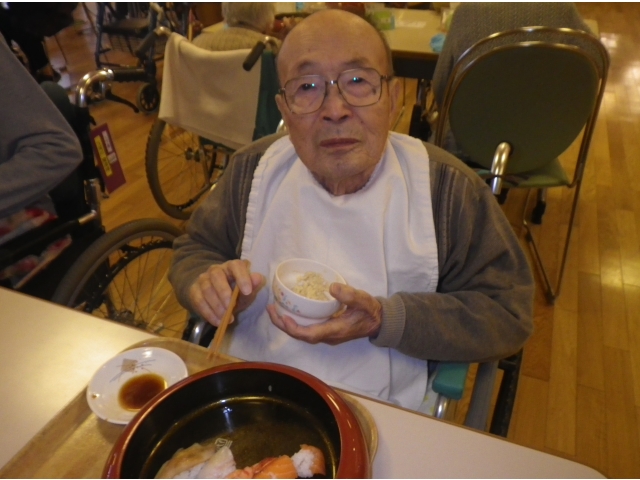 利用者の皆様、普段食事があまり進まない方も、お寿司とな