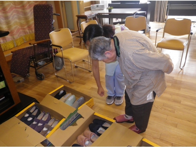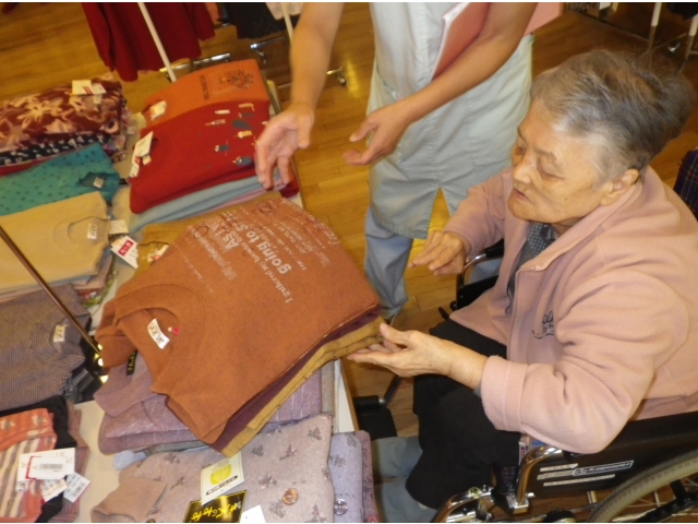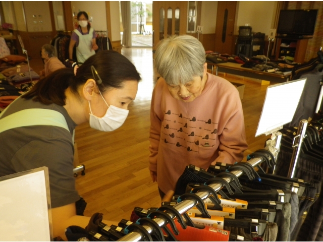 冬物衣料展示販売最近ではめっきり朝夕寒くなりましたが、皆様いかかお過ごしでしょうか。小牧苑では本日冬物衣料販売が行われました。展示販売なので、食堂に様々な冬の衣料品が並びます。普段なかなか目の前で洋服を選べる機会が無いため、参加する利用者の方も楽しそうに洋服を選んでいきます。いつまでもオシャレな利用者の方々です。