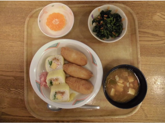 昼食は、巻き寿司・いなり、菜の花の和え物、豚汁、みかん、甘納豆です。