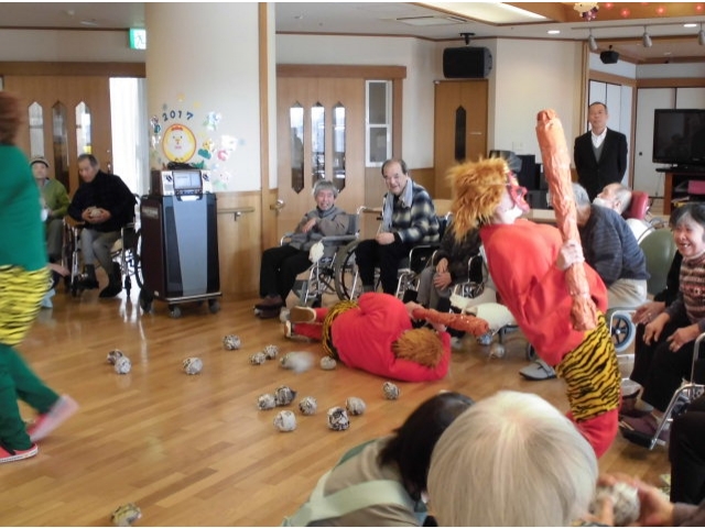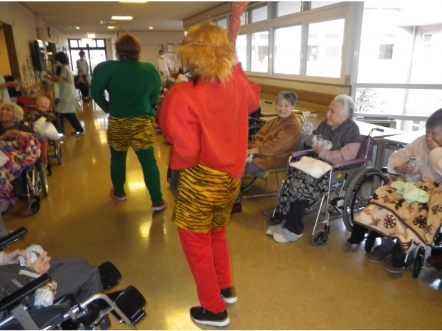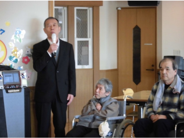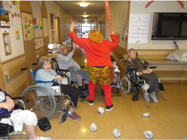 苑長からの挨拶、年男・年女の紹介、そして・・・3匹の鬼の登場です!