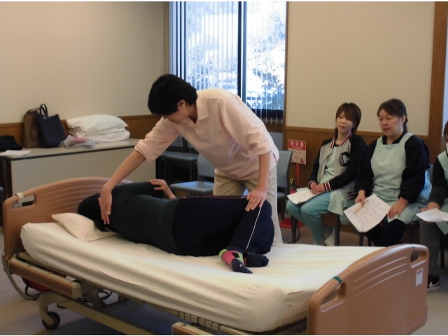 2月14日小牧苑では、名古屋柳城短期大学 大崎千秋先生をお招きして、ICF(国際生活機能分類)を活用した移動・移乗技術の研修を行いました。