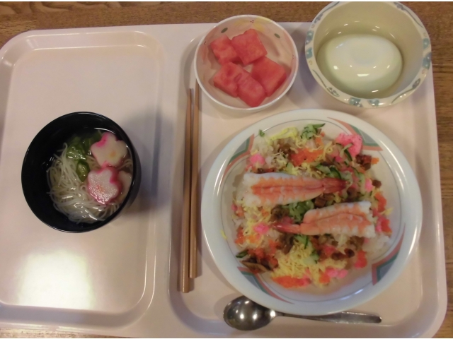 昼食はちらし寿司やそうめん汁、枝豆豆腐、スイカ