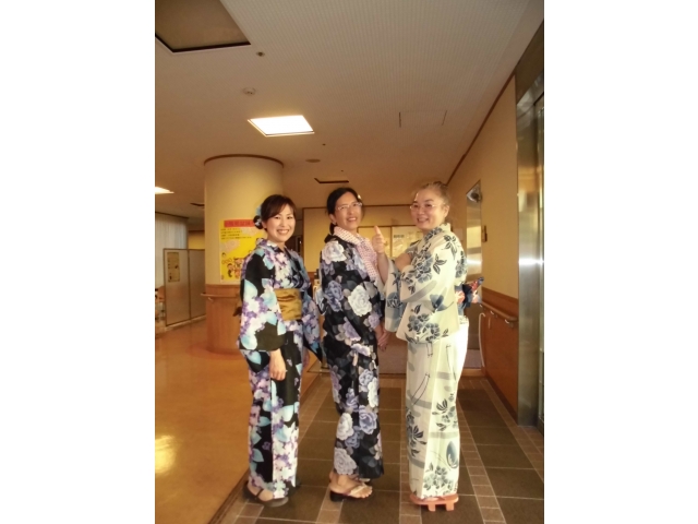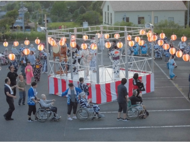 盆踊りに参加する利用者のみなさんや職員は、浴衣やはっぴに着替え準備万端。前半は炭坑節など利用者さんも交えて歌ったり踊ったり、和やかなムードで開始しました。