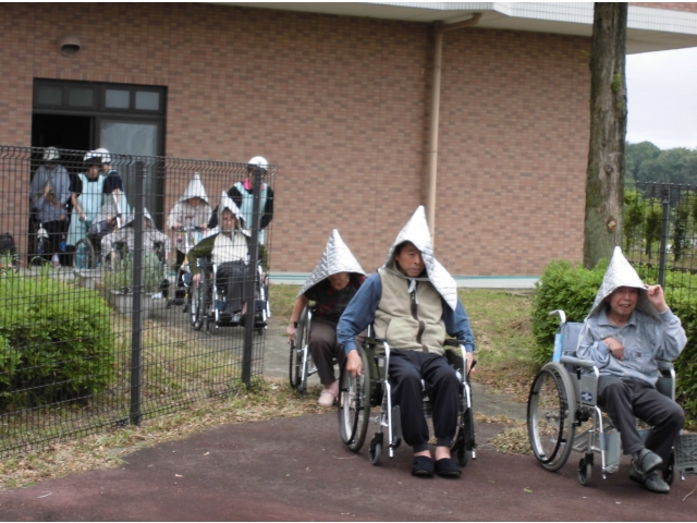 職員が利用者のみなさんに対し、「こちらから出ますよ」と声かけしたり、防災頭巾がうまくかぶれない方に介助をすると、落ち着いて避難することができました。