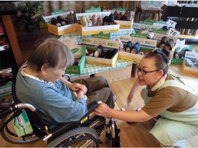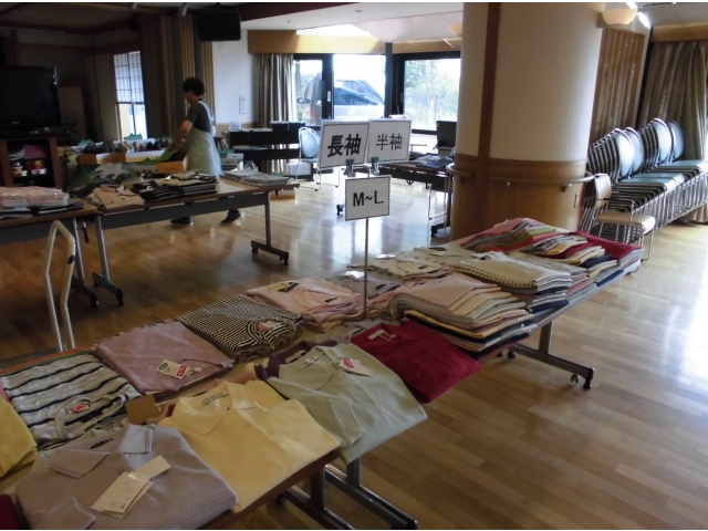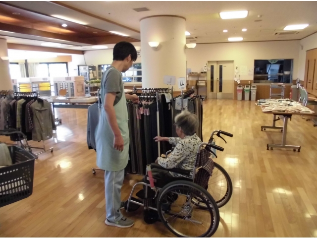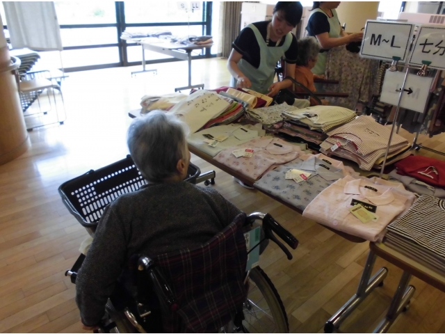 6月12日 夏物衣料販売を開催しました。業者の方には、肌着やシャツ、ズボン、靴などをそろえていだだきました。 利用者のみなさんは、肌ざわりや履き心地を確かめたり、色違いはあるか業者の方に確認したり、夏に向けてのショッピングを楽しまれました。